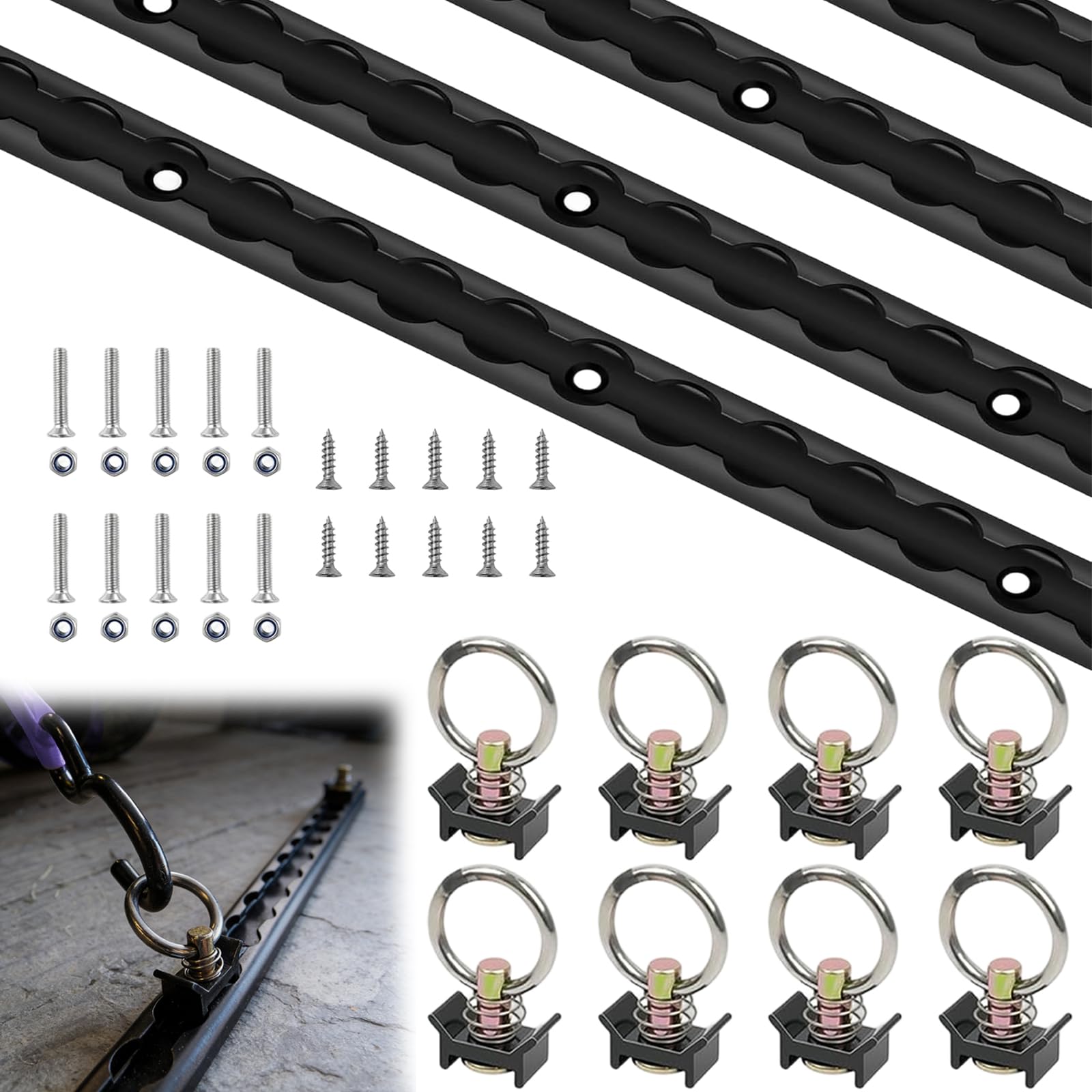 Premium Aluminum Construction: Made from high-grade black aluminum, this 4Pcs 4ft L-Track delivers superior resistance for dependable long-term cargo securement in all conditions. Premium Hardware: Equipped with 8 Single industrial-grade stainless steel stud O-Ring Fittings and 20 mounting screws, e