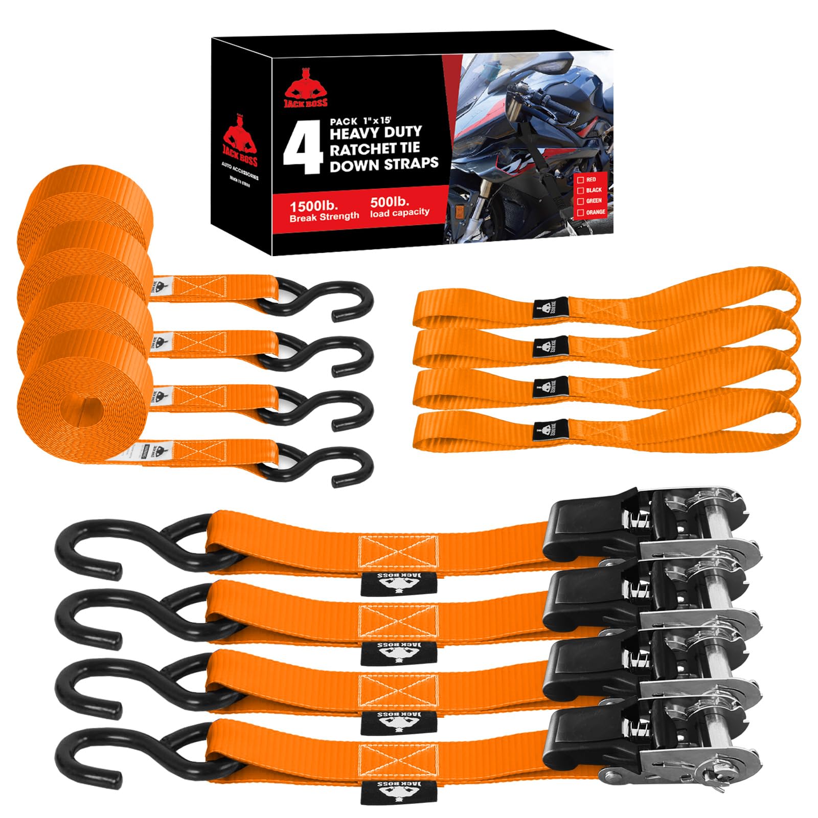 Jack Boss Ratchet Tie Down Straps Set,1500 lbs Break Strength,1" x 15' Heavy Duty Ratchet Straps with 4X Soft Loops Padded Handles Coated S Hook, Fits