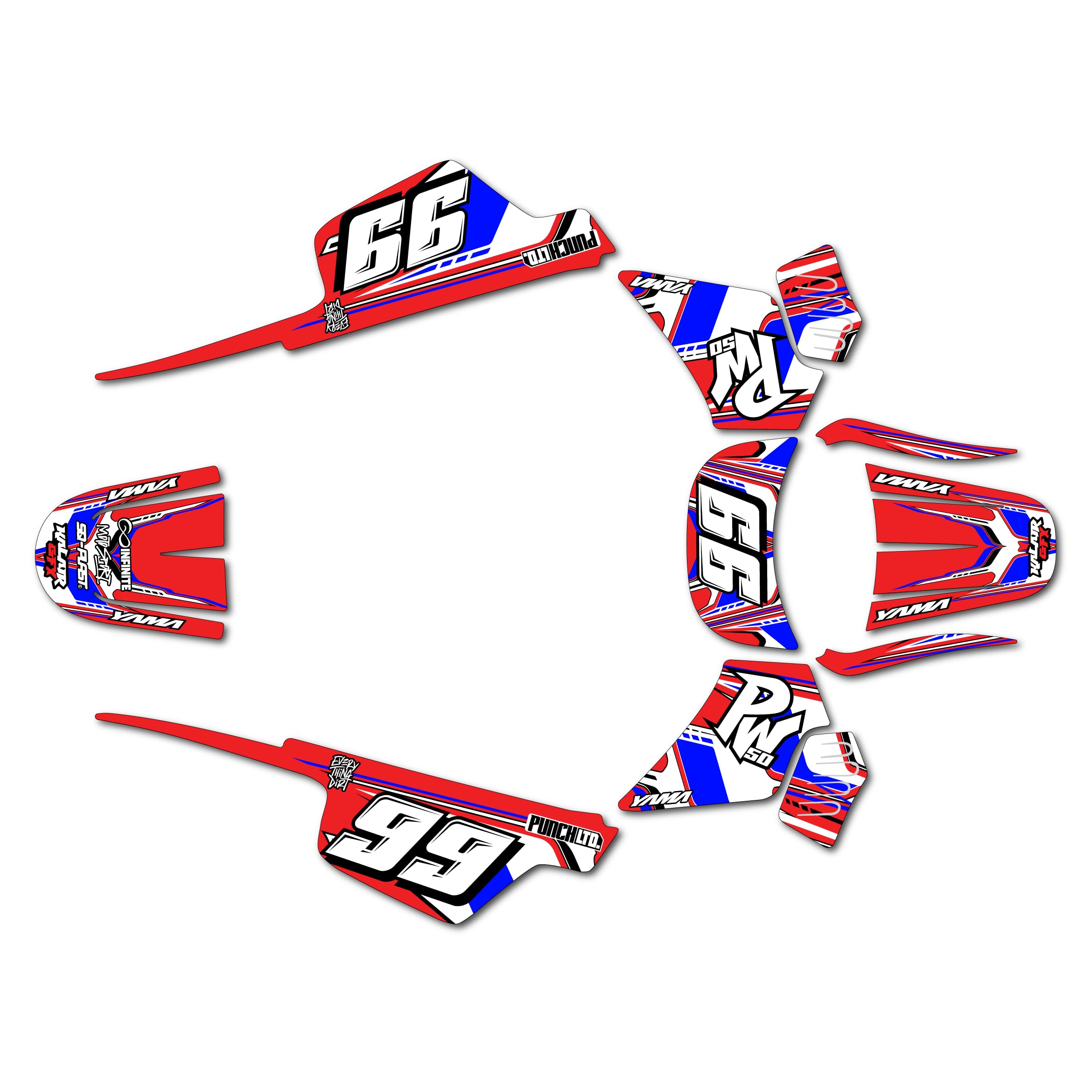 Fits PW50 (AllYears) on OEM or OEM-replica plastics. Complete graphics kit, includes all pieces shown in the listing. Plastics NOT included. Thicknesses for durability against scratches and falls: 9 Mil - for light use, 16 Mil - high durability, 21 Mil - max durability Market leading designs printed