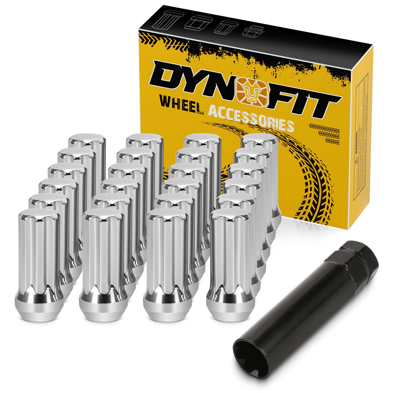 Dynofit 14x1.5 Chrome Lug Nuts Set, 24pcs 7 Spline Drive Wheel Nut for Silverado Sierra Ram 1500 F150, Silver Steel Aftermarket Lugnuts with 1 Socket