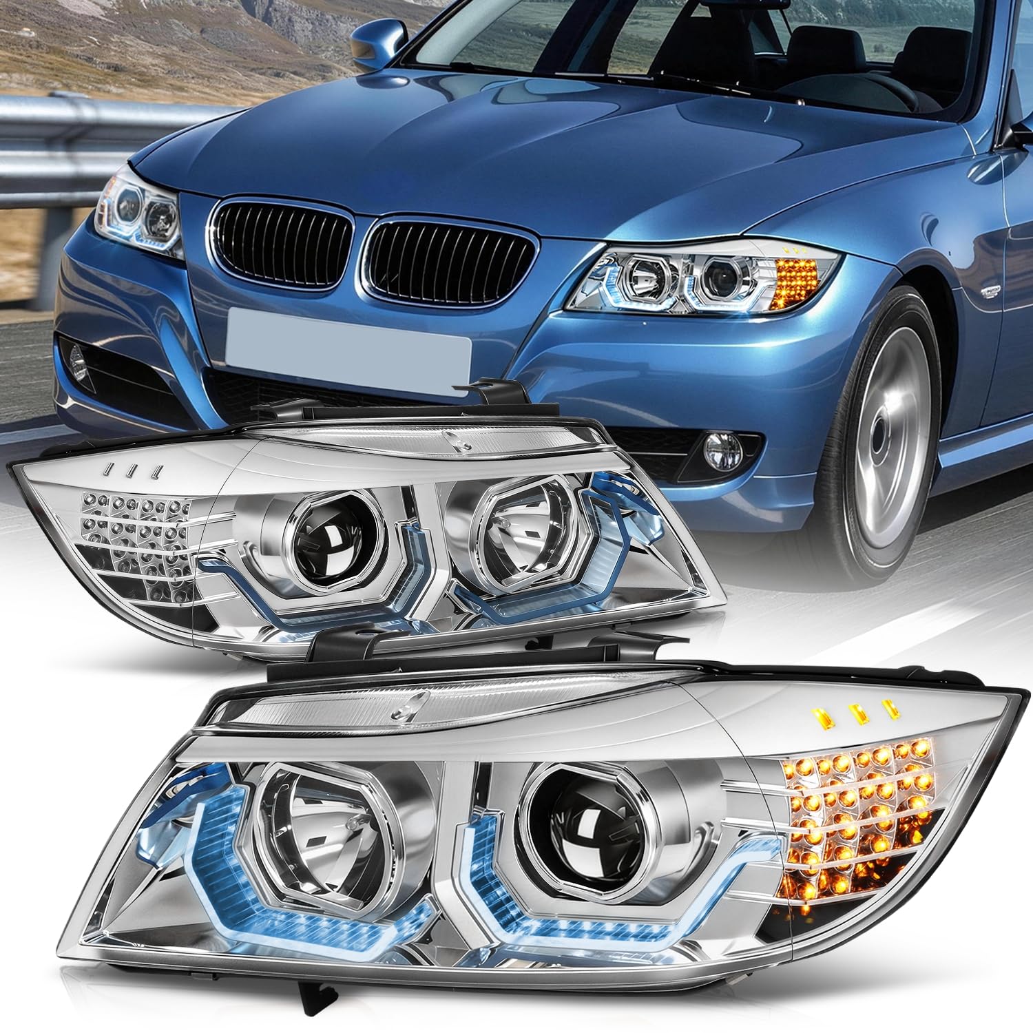 These lights are compatible with BMW 320i 2012, BMW 323i 2009-2011, BMW 325i 328i 335i 335d 2009-2012, ONLY fits sedan wagon halogen models without AFS function. Does NOT fit HID Headlight Model Vehicles. Does NOT fit Coupe / Convertible Models. Come with [2] headlights with 3D crystal LED U-halo da