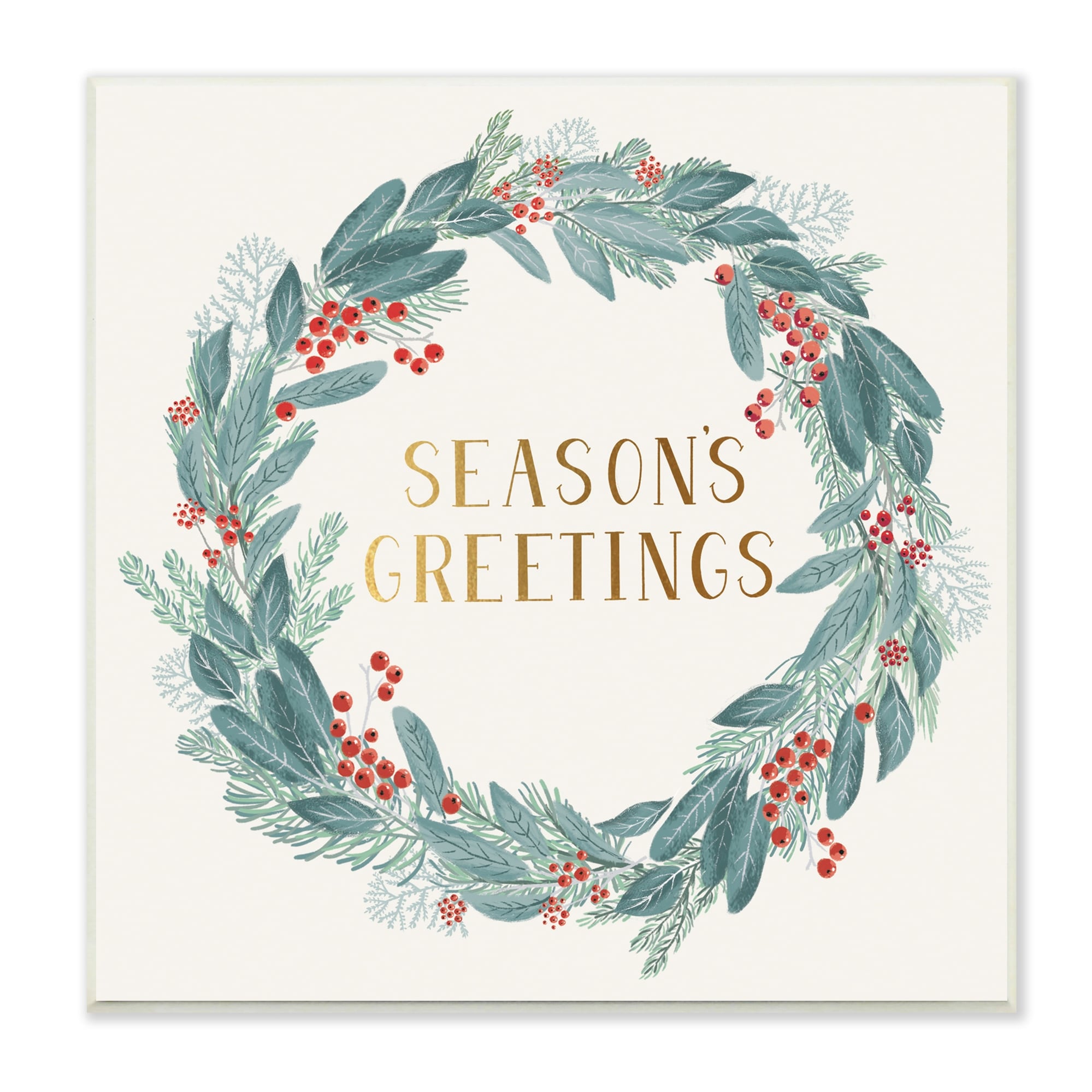 Stupell Winter Foliage Red Holly Wreath Season's Greetings Typography Wood Wall Art