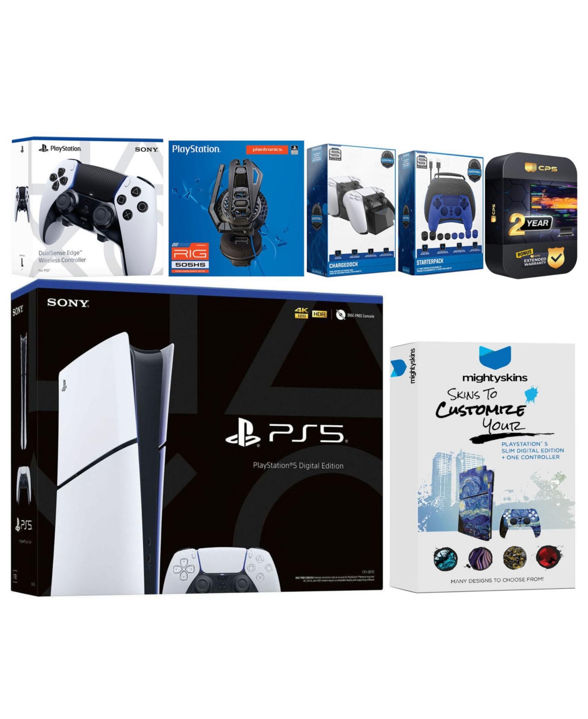 Sony Playstation 5 Slim Digital with Extra Edge Controller, Plantronics Headset, Gamer Kit, Charge Dock and MightySkins Decal Voucher + 2 Year Cps Ext
