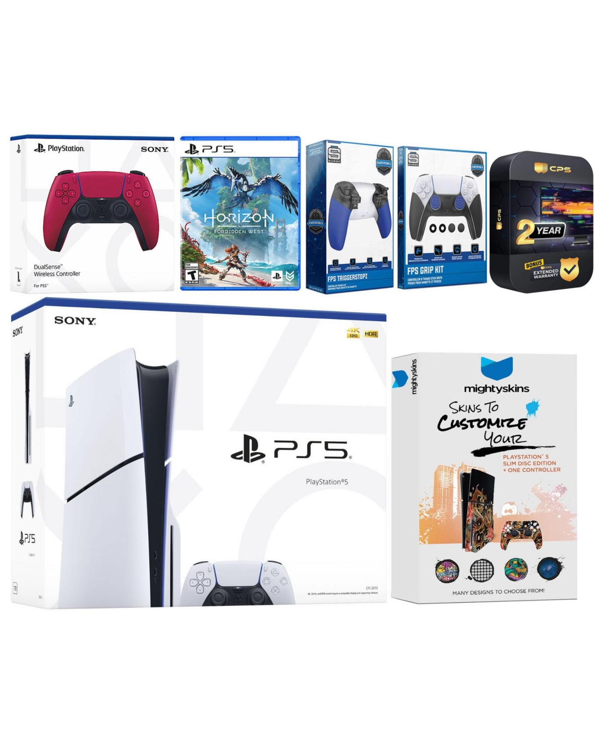 Sony Playstation 5 Slim Disc with Horizon Forbidden West, Extra Controller, Trigger Stop Kit, Fps Grip Kit and MightySkins Decal Voucher + 2 Year Cps