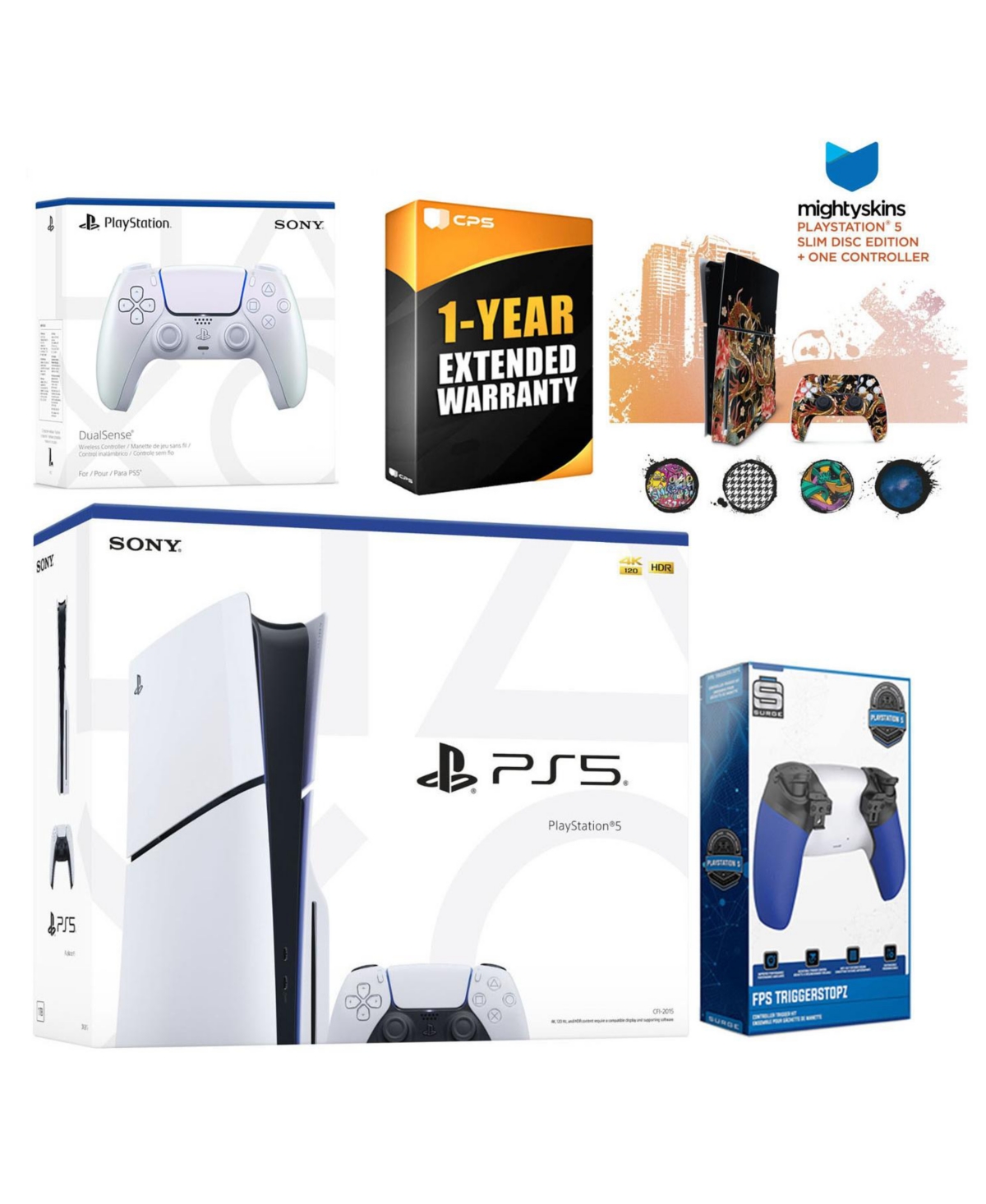 Sony Playstation 5 Slim Disc with Extra Controller, Trigger Stop Kit and MightySkins Decal Voucher + 1 Year Cps Extended Warranty - Chroma pearl