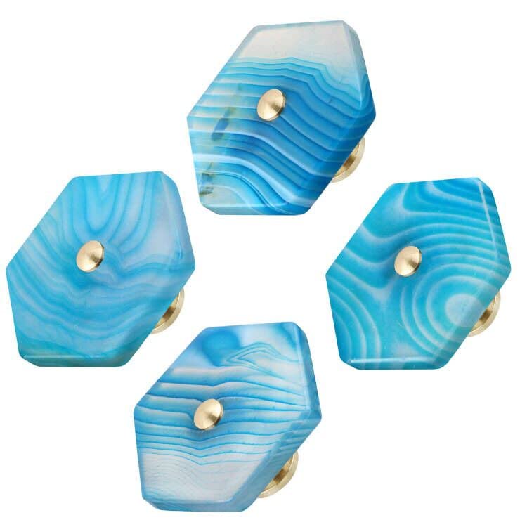 Rockcloud Set of 4 Hexagonal Agate Slice Drawer Knobs with Screws, Polished Stone Handle Pulls for Cupboard Dresser Wardrobe Office Home Decor, Blue