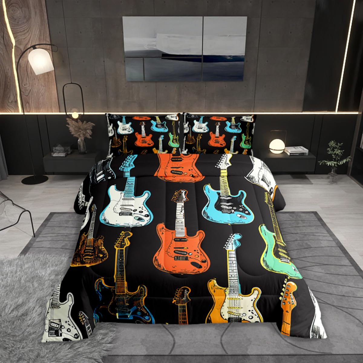 Castle Fairy Colorful Guitar Bedding Set Full Size Musical Instruments Comforter for Child Toddler Teens Rock Bass Music Lover Down Comforter Sketch