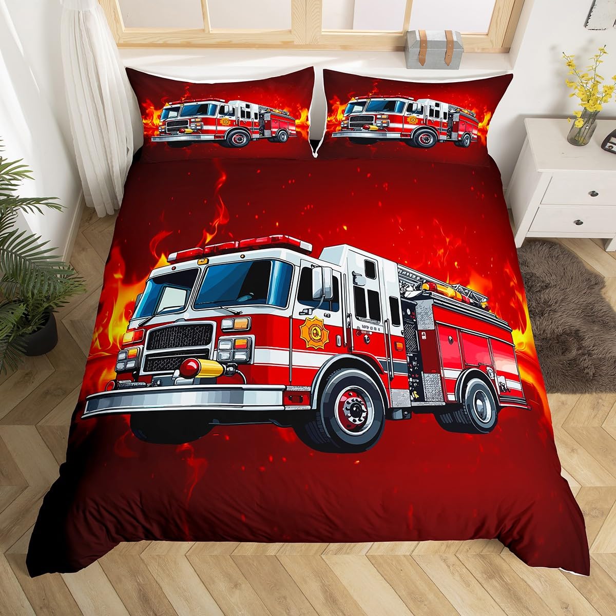 Firefighter Truck Duvet Cover Kids Firemen Car Vehicle Bedding Set for Boys Girls Children Teens Bedroom Decor Fire Engine Pattern Comforter Cover Red