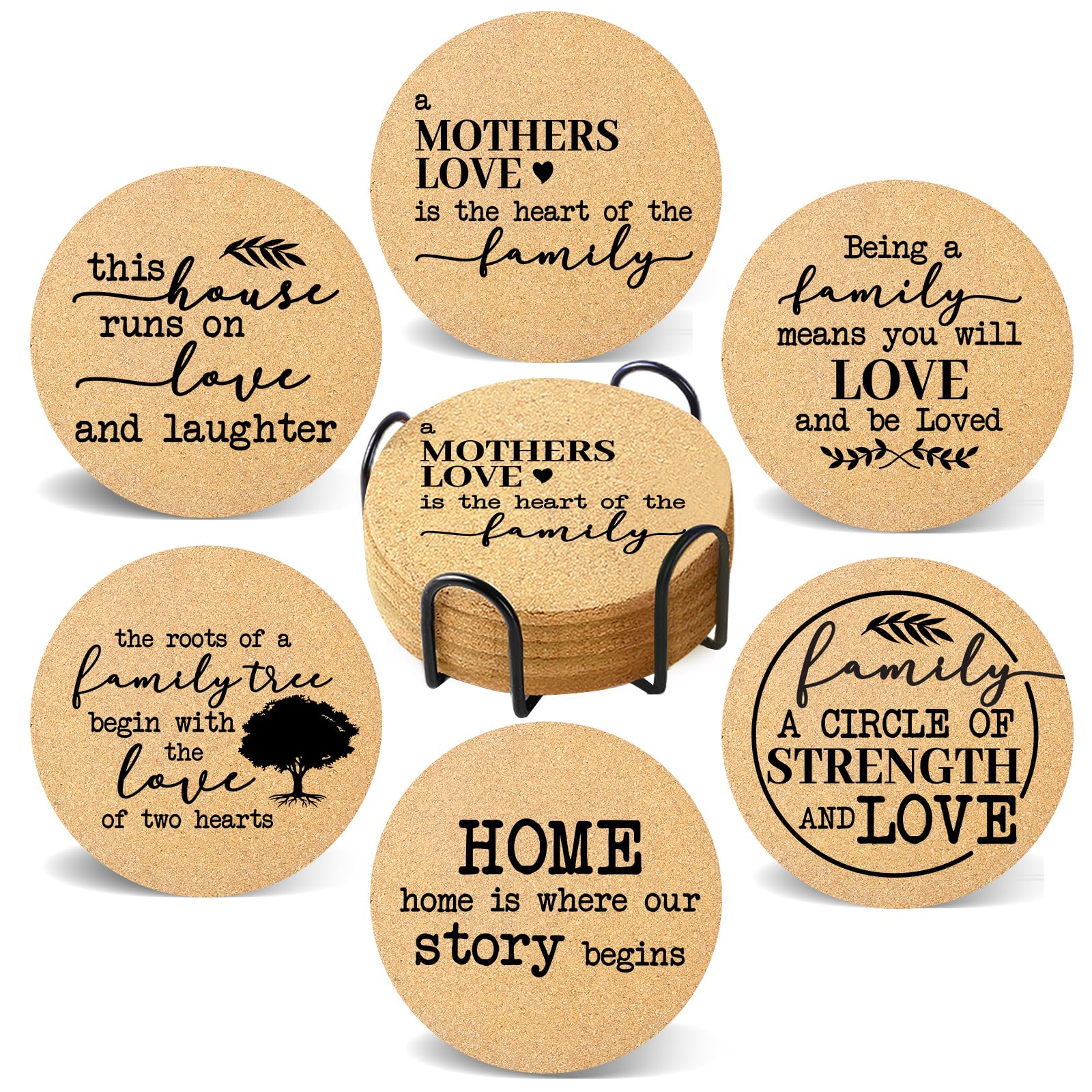Cegkuc Coasters for Drinks with Holder Set of 6, Family Coasters Home&Love Coaster for New Home Couples House Warming Gifts Absorbent Cork Wood for