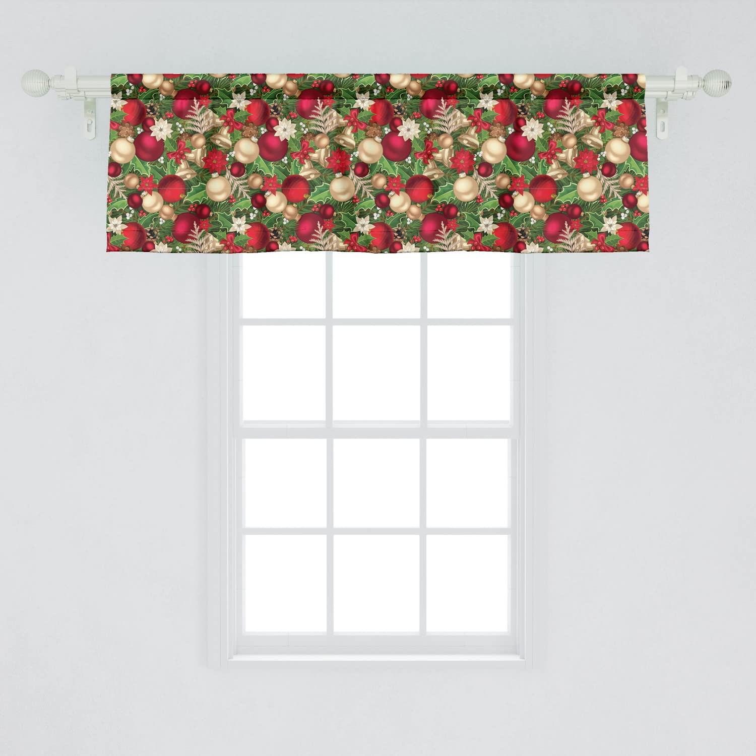 Ambesonne Christmas Window Valance Pack of 2, Tree Branches Spruce Leaves Balls Bells Cones Poinsettia Flowers Mistletoe Berry, Rod Pocket Curtain