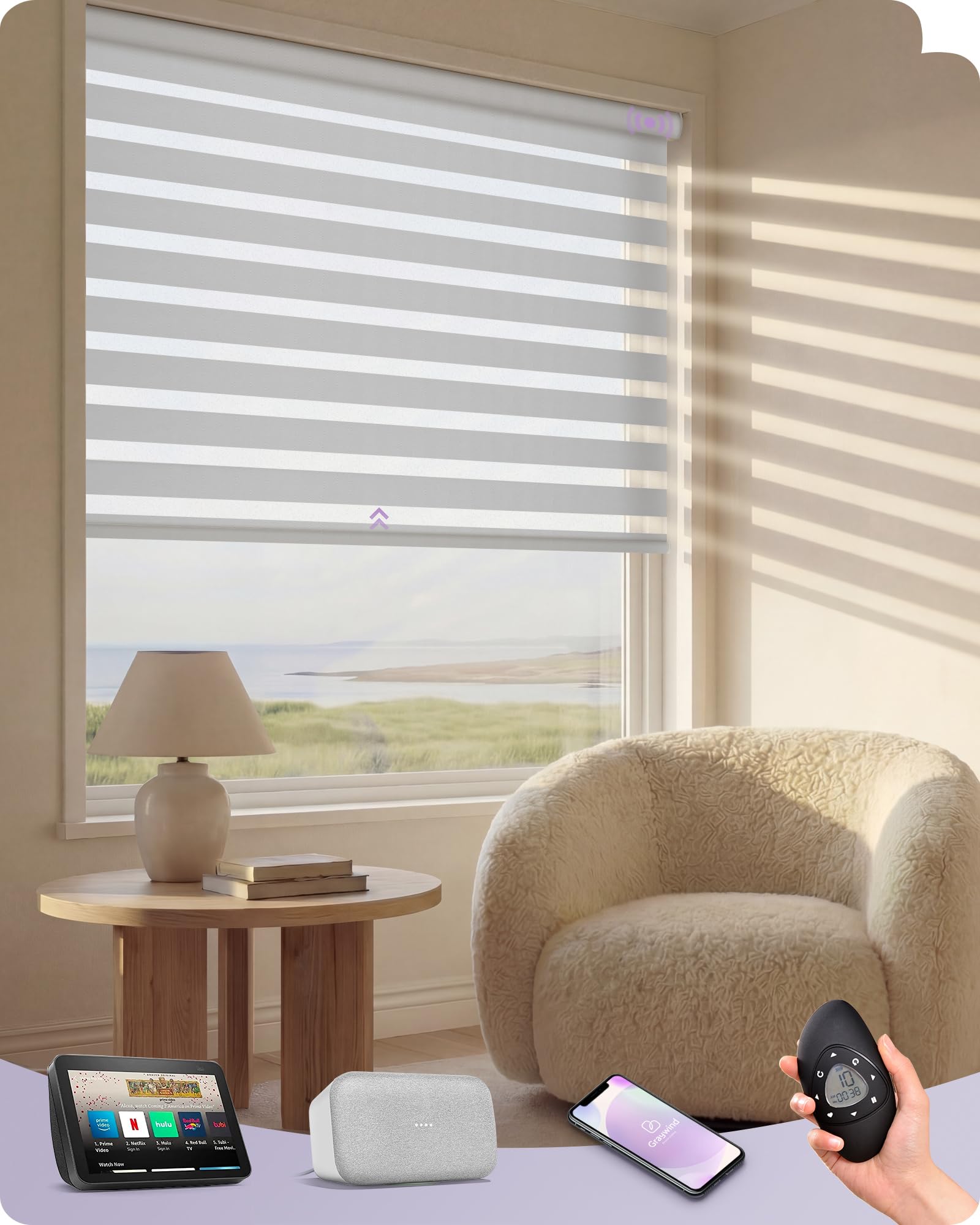 Smart Motorized Zebra Blinds with Remote Control: Elevate your home with Graywind smart window shades. These electric zebra blinds offer seamless app & voice control via Alexa, Google Home, and Apple HomeKit. Enjoy effortless operation and perfect lighting automation for any room. Adjustable Light &