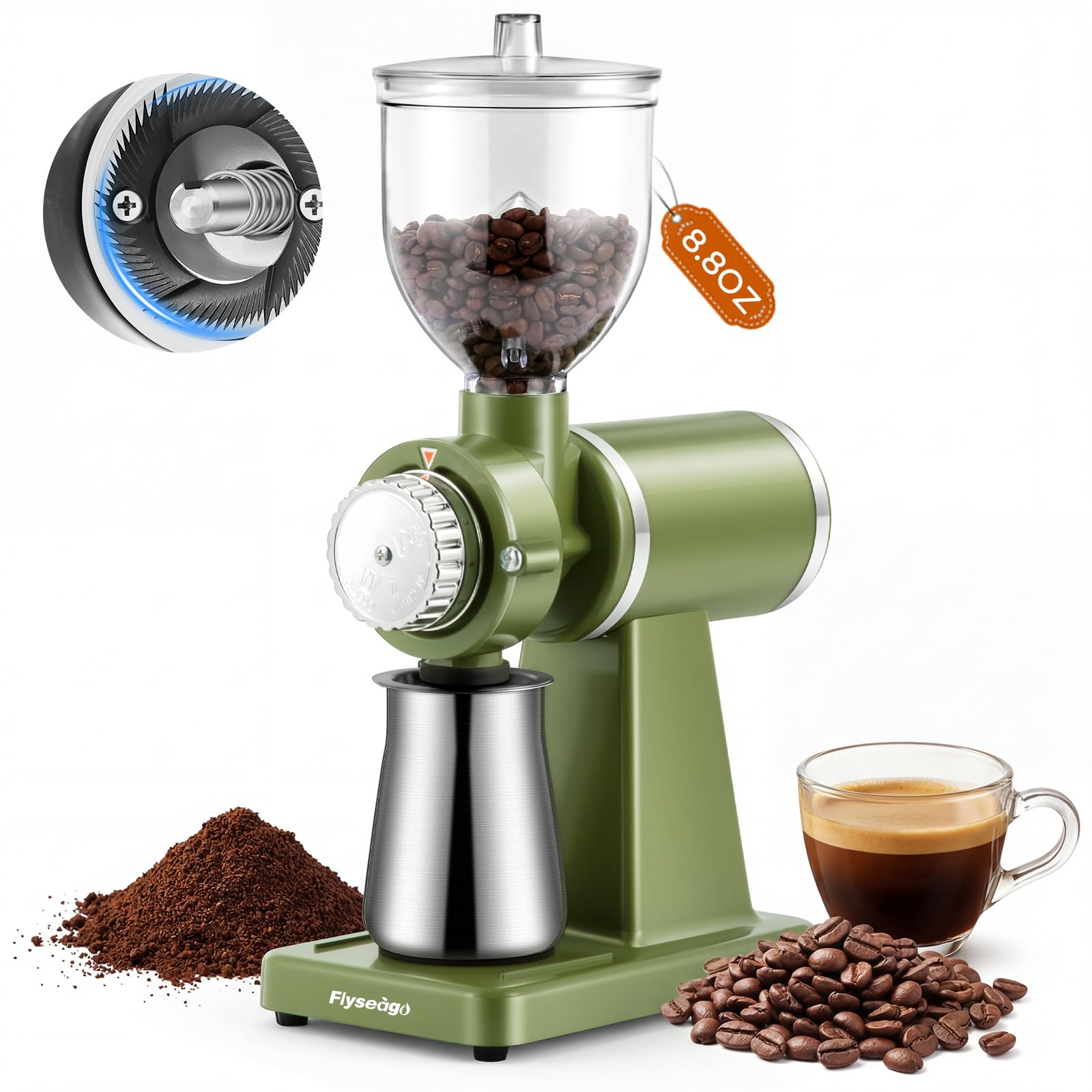 Electric Burr Coffee Grinders for Home Use, 8 Adjustable Settings Stainless Steel Flat Burr, Quiet Low Static Design for Espresso Pour Over French