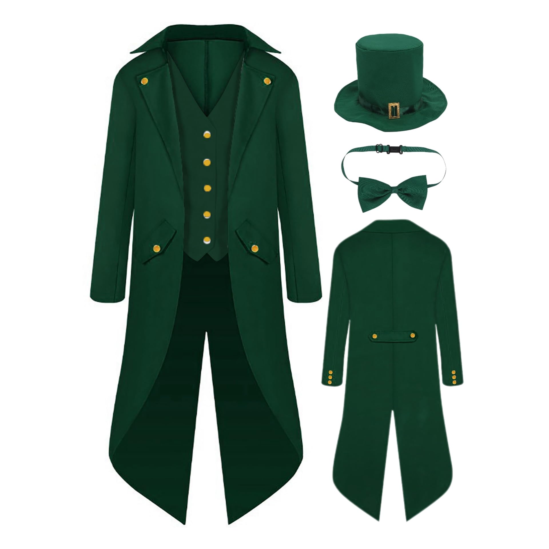 Complete Set: Includes a Victorian-style tailcoat jacket with vest, matching top hat with decorative buckle, and coordinating bow tie in deep forest green Design Features: Long green Renaissance mens tailcoat with gold-tone buttons, notched lapels, and dual front pockets Multiple Options: The Steamp