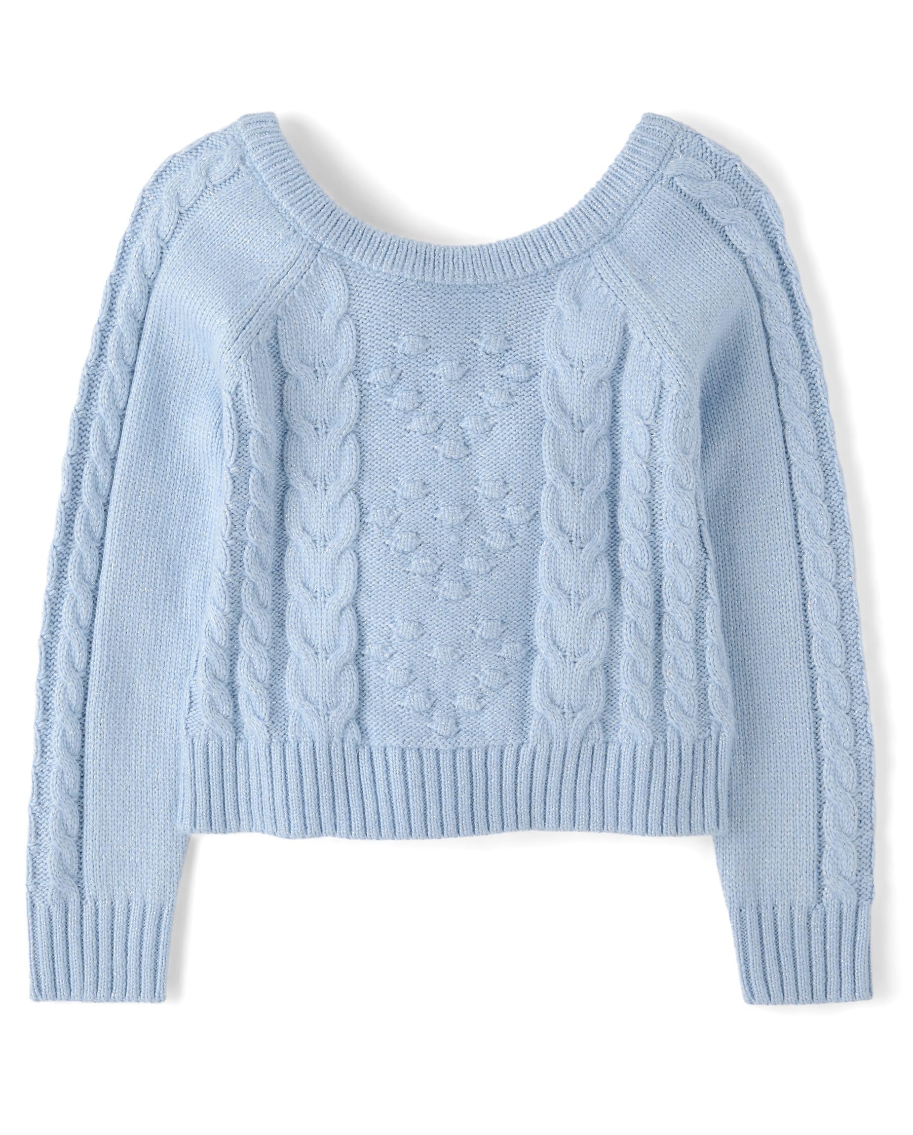 FABRICATION: 45% LENZING ECOVERO viscose/45% recycled polyester/8% nylon/2% metallic, imported FIT & DESIGN: Rib-knit crew neck, long raglan sleeves, rib-knit cuffs & hem FEATURES: Low-cut V-back with non-functional satin bow, metallic threading, cable knit & bauble stitch hearts at front GYMBOREE