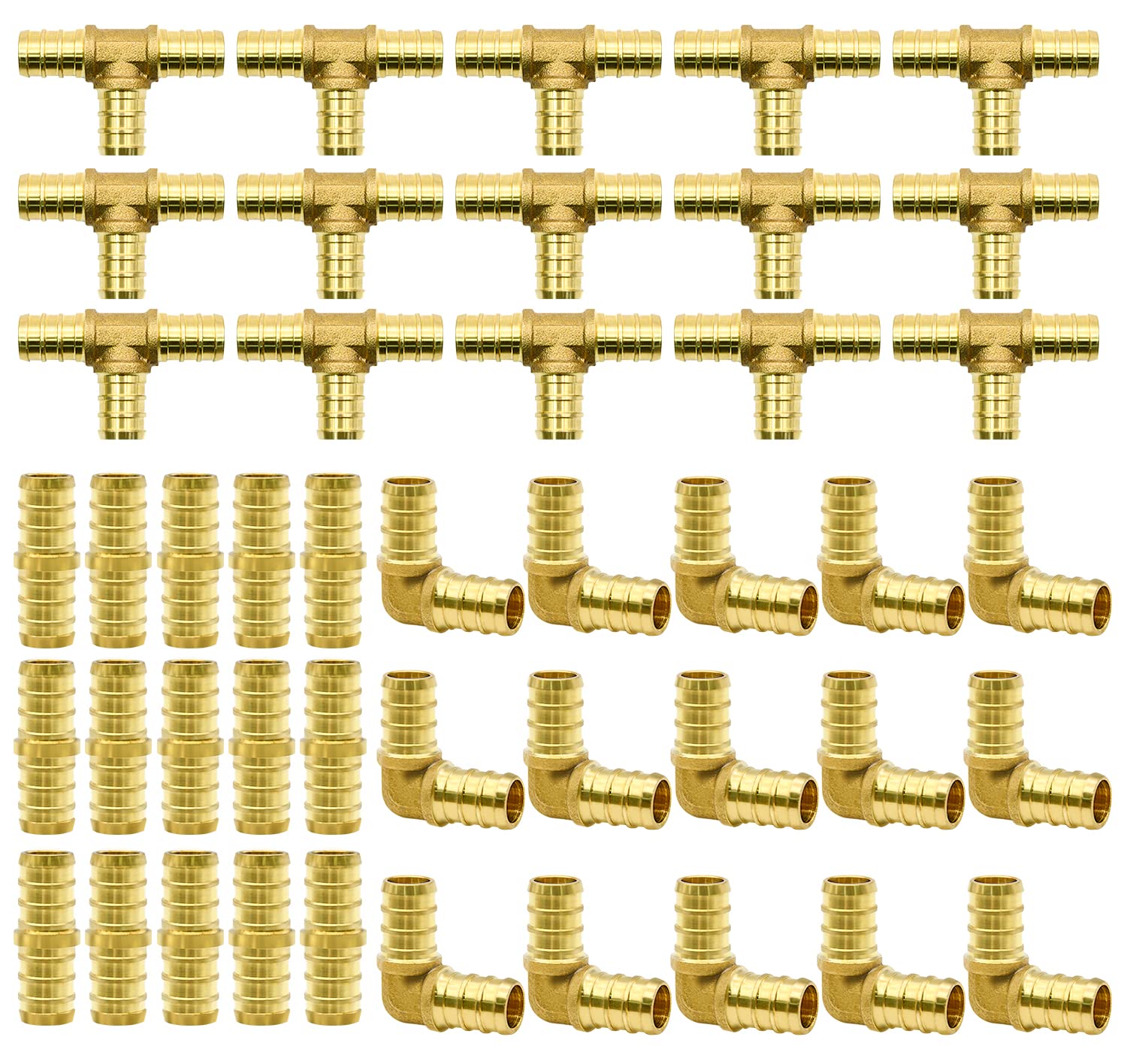 【Package Includes】- PEX brass crimp fitting combo includes 15pcs 1/2" tees"T", 15pcs 1/2" elbows, 15pcs 1/2" straight couplings, They are used for hot or cold water systems. 【Premium Material】- They are made of durable brass and they can be used for PEX pipes in plumbing jobs. and they resis
