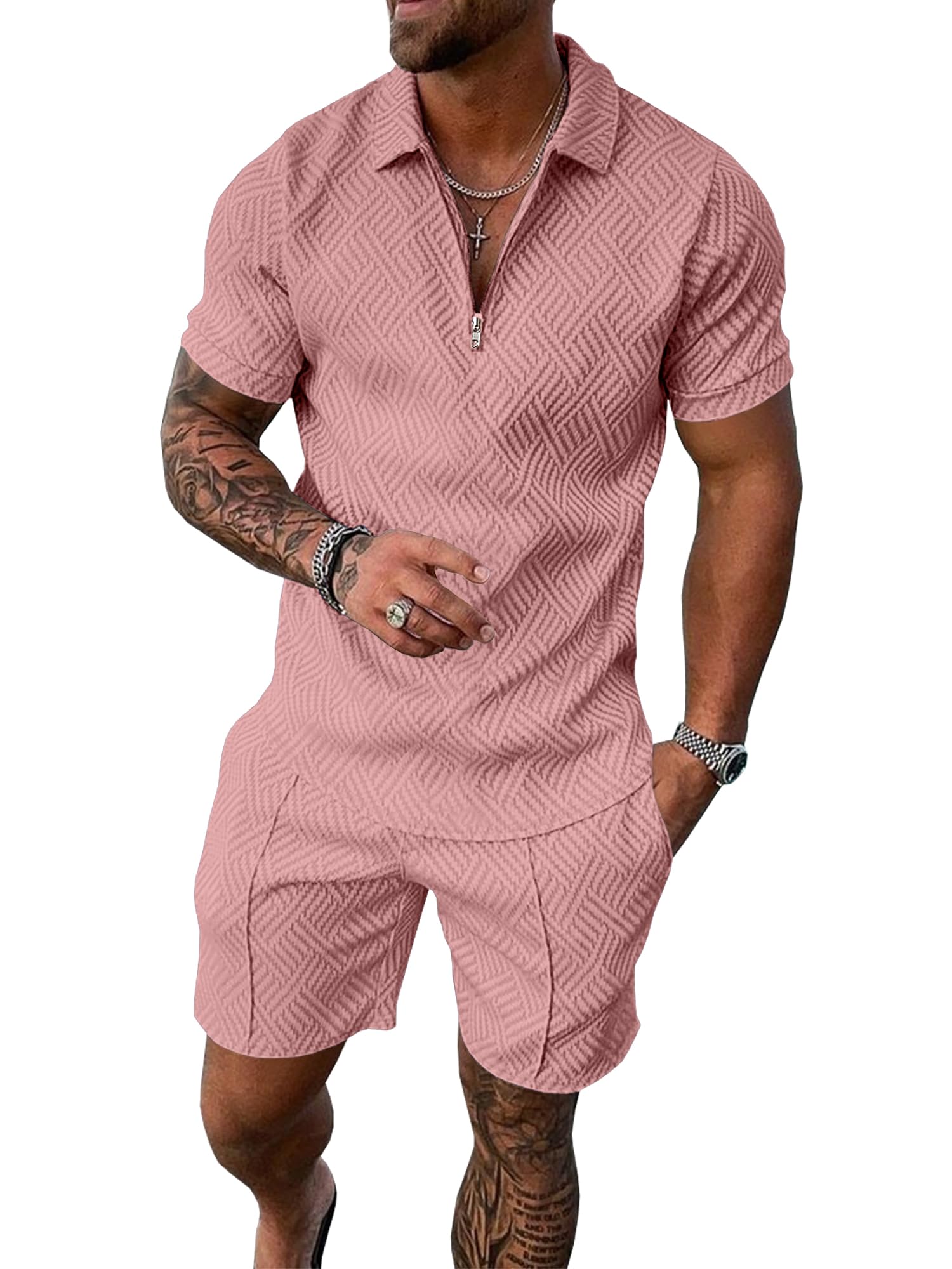 UOUA Mens Summer Track Suits 2 Piece Shorts Sets Short Sleeve Sweatsuit Outfits 1/4 Zip Golf Polo Shirts Loungewear