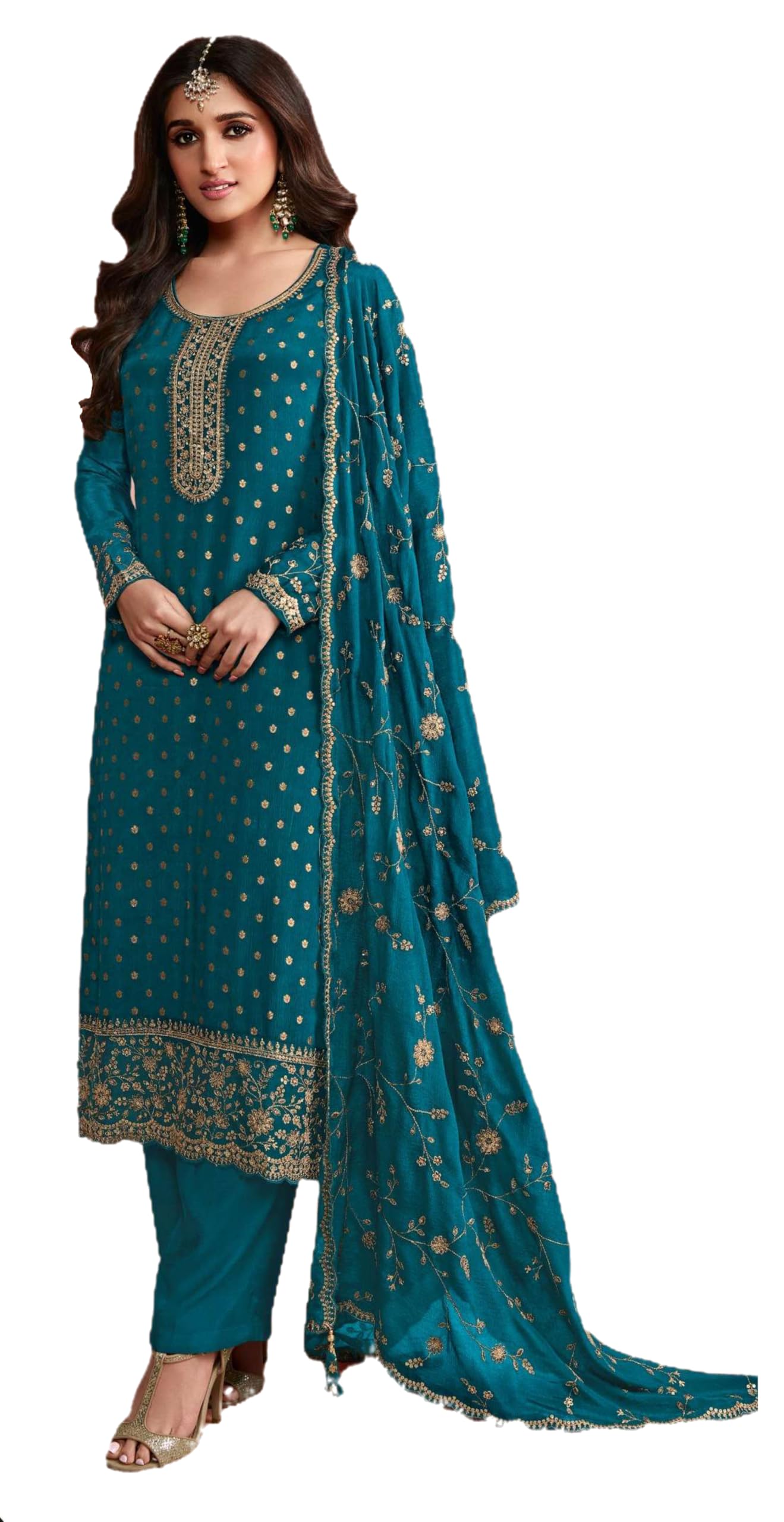 This Salwar Suit is Ready to Wear; Please refer to our size chart (2nd image) carefully and then select appropriate size, Contact us directly for customize the measurements. Top Fabric: Jacquard Silk + Sequin Embroidery Work || Dupatta fabric: Silk + Embroidery Work || Bottom Fabric: Dull Santoon ||