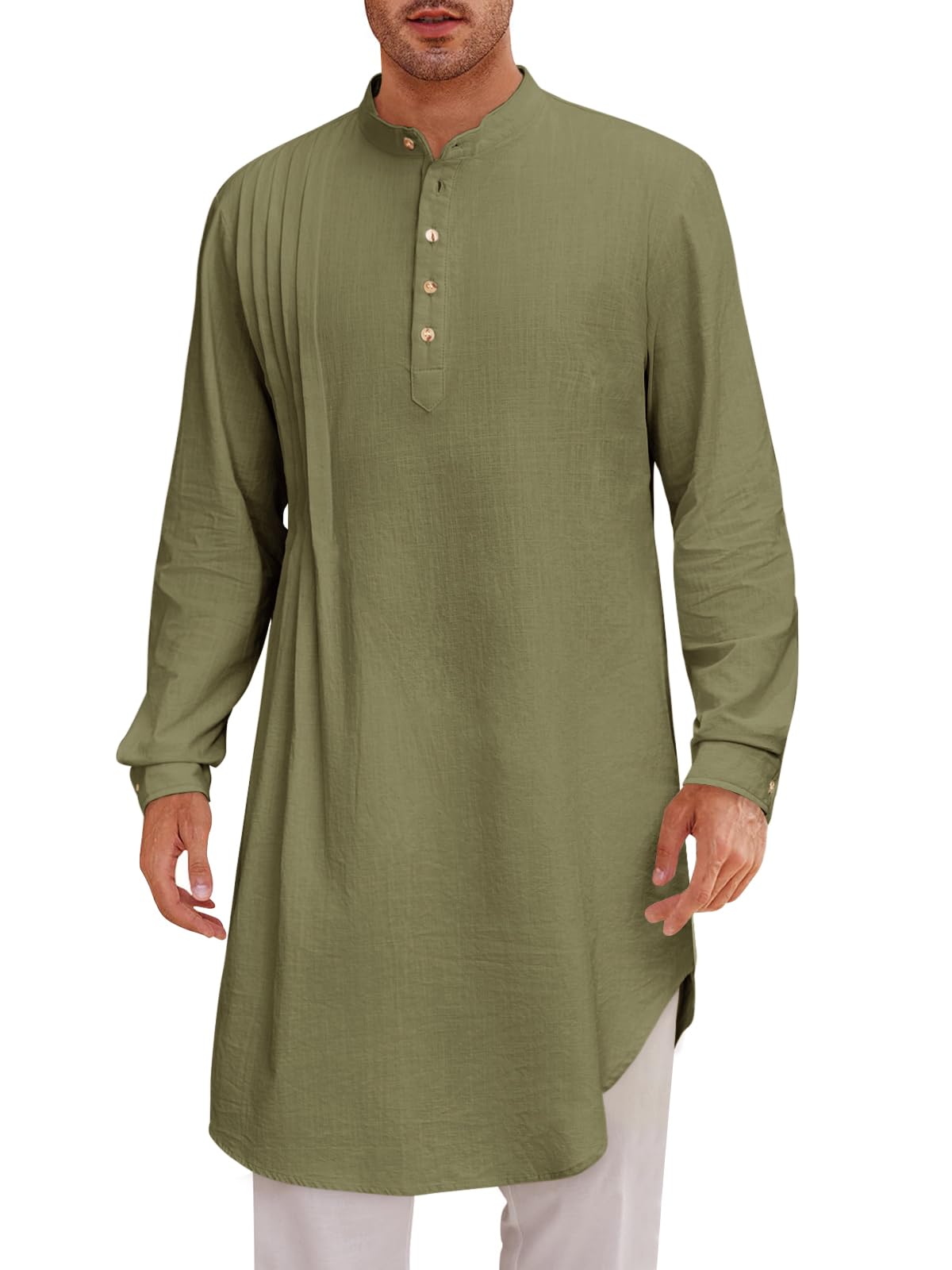 【Design】 Mens Linen Kaftan Thobe features with henley neck, button up, knee length, long sleeve, solid color, pleated decoration at chest and curved hemline. Enhance your overall appearance while providing a comfortable wearing experience. 【Fabric】 This mens long sleeve long henley shirt is
