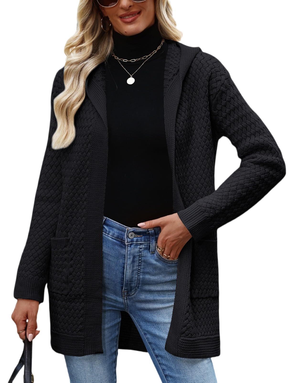 Effortless Layering Essential: Open-front hooded cardigan for women; combines relaxed silhouette with textured knit design; easy to throw on over any outfit; ideal for fall, winter, and cool spring days Fashion Knit Detailing: Features mixed waffle and braided stitching for a premium feel; two front