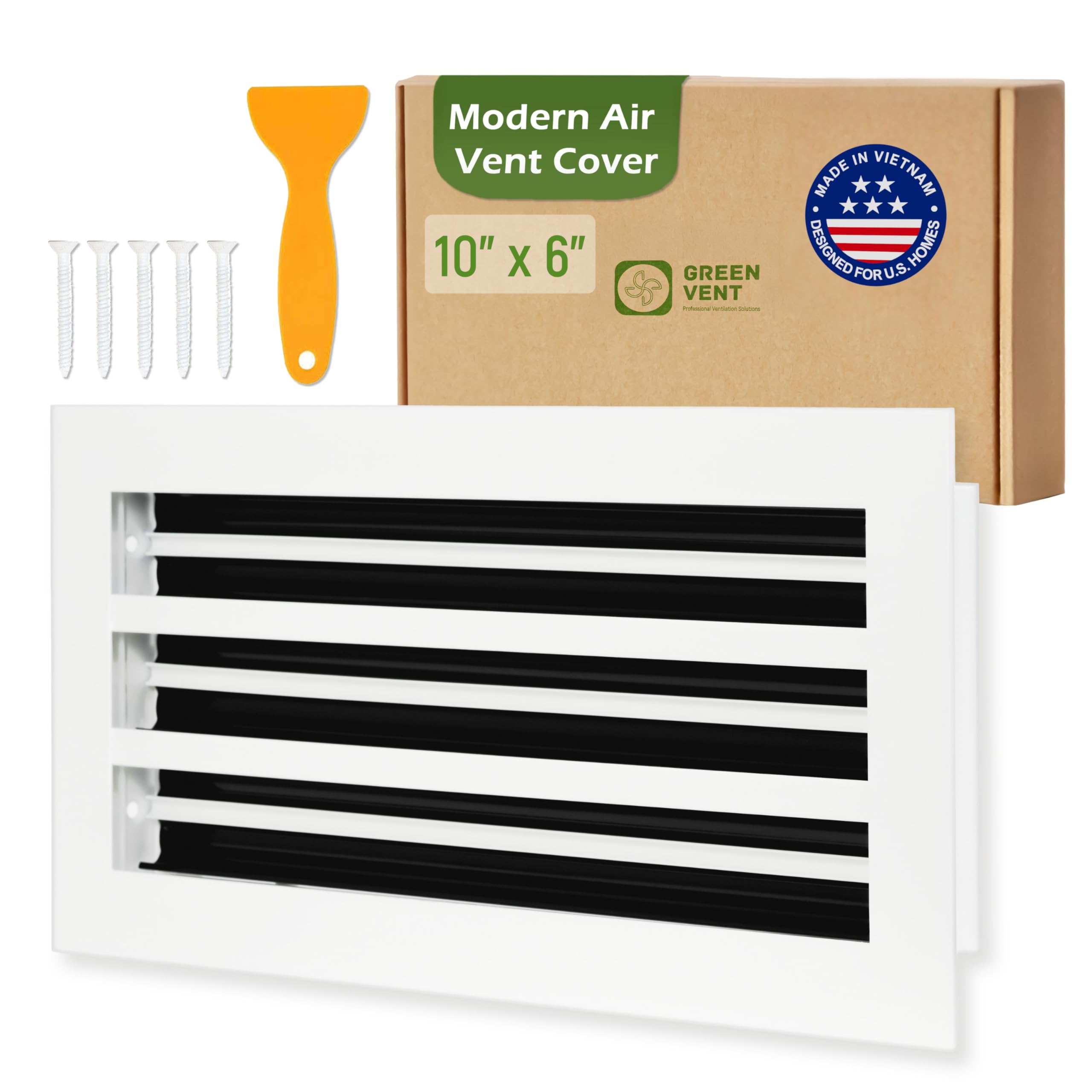 ⚠️ CHECK SIZE BEFORE PURCHASE – Listed size 10"x6" = fits duct opening 10"x6". Neck size: 9-13/16" x 5-13/16" (± 1/8") – fits inside the duct opening. Face size: 11-3/4" x 7-3/4" (± 1/8") – this is the visible cover on the wall, ceiling or floor. Please measure the duct opening carefully (not the old vent cover’s face size) before ordering. Choosing the wrong size is the #1 reason for returns. PREMIUM ALUMINUM DIFFUSER – GREEN VENT Premium Aluminum Air Vent Diffuser with Black Linear Blades. Crafted from solid aluminum alloy that is rust-proof, warp-free, and built for long-term durability. Expertly engineered and MADE IN VIETNAM – U.S QUALITY STANDARD, this 6x10 vent cover and linear slot diffuser delivers smooth airflow distribution for walls, ceilings, or floors in bathrooms, kitchens, and living rooms. MODERN ARCHITECTURAL DESIGN – Decorative vent grill cover with white aluminum frame and black linear blades. Hidden side screw holes create a seamless finish, ideal for wall vent cover, ceiling vents 6x10 or 10x6 wall registers QUIET & ADJUSTABLE AIRFLOW – Engineered with aerodynamic black linear blades that direct airflow smoothly and reduce noise. Includes an adjustment bar for easy airflow control using simple tools. Wider slots provide higher air volume and quieter performance compared to standard vent designs. Works as a hvac register cover, ceiling register 6x10 white or floor register 6x10 white replacement. EASY INSTALLATION & SUPPORT – Designed for retrofit use, this register vent fits standard duct openings and installs easily in minutes. Please follow the installation guide for best results. If you need help, GREEN VENT support is always available. Suitable for supply or return air vents, ac ceiling vent covers or modern air registers.