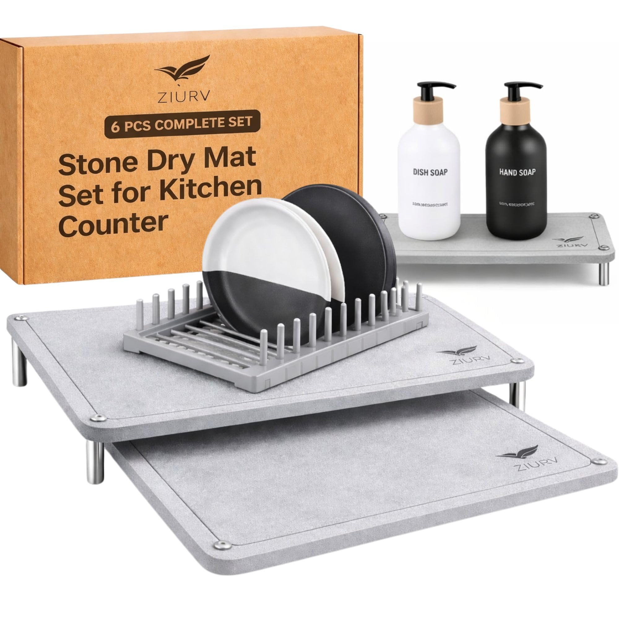 6 PCS Stone Drying Mat Set for Kitchen Counter, 2 Large Diatomaceous Earth Dish Drying Mats with Stainless Steel Legs, Dish Rack, Soap Dispenser Set($48.33Value)