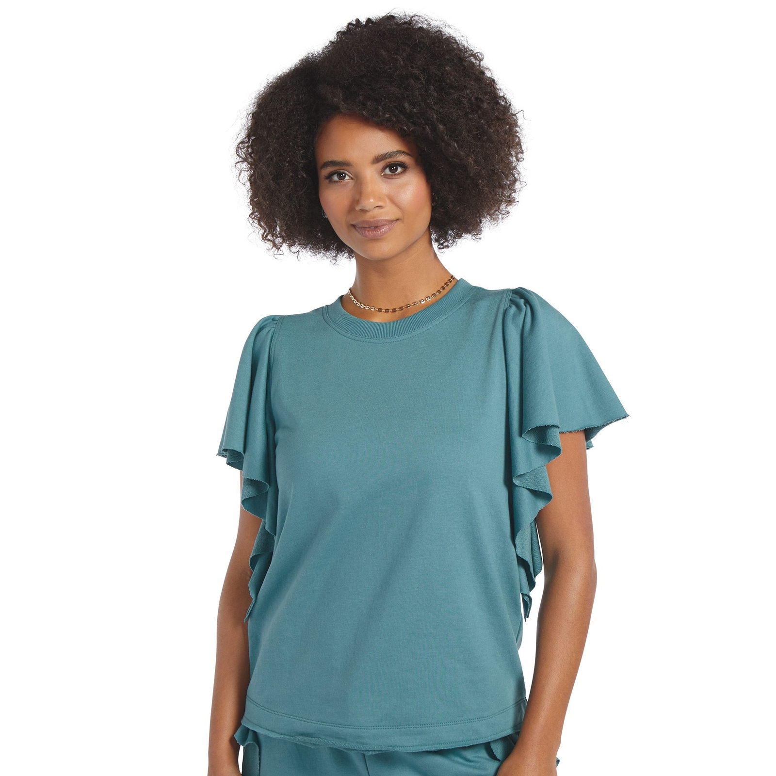 *Relaxed-fit top with flirty ruffled sleeves and raw hem detail *Crew neckline *Polyester/cotton *Machine wash *Import