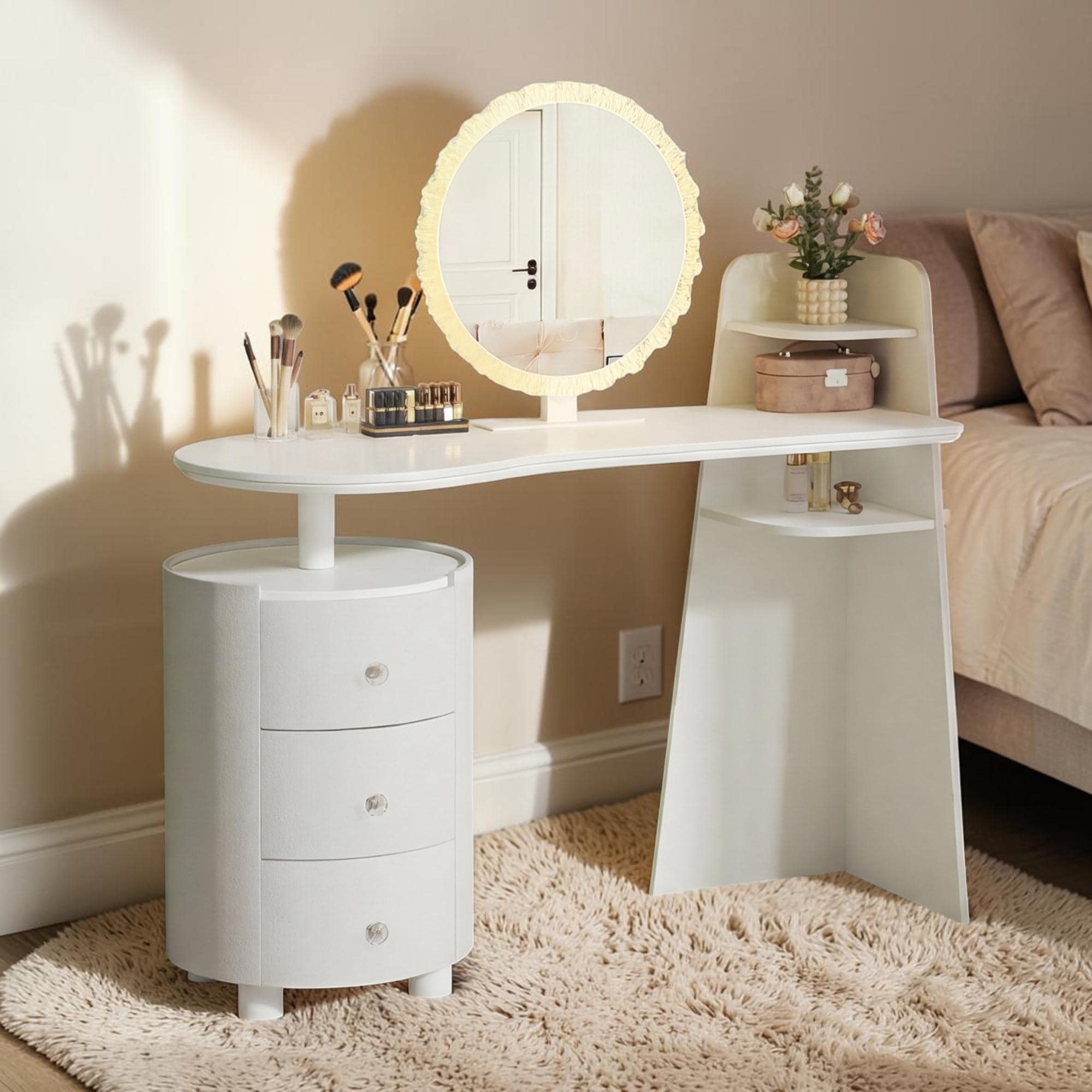 Modern Vanity Desk with LED Round Mirror, Rotating Storage Cabinet, Makeup Vanity Table with 3 Tier Organizer