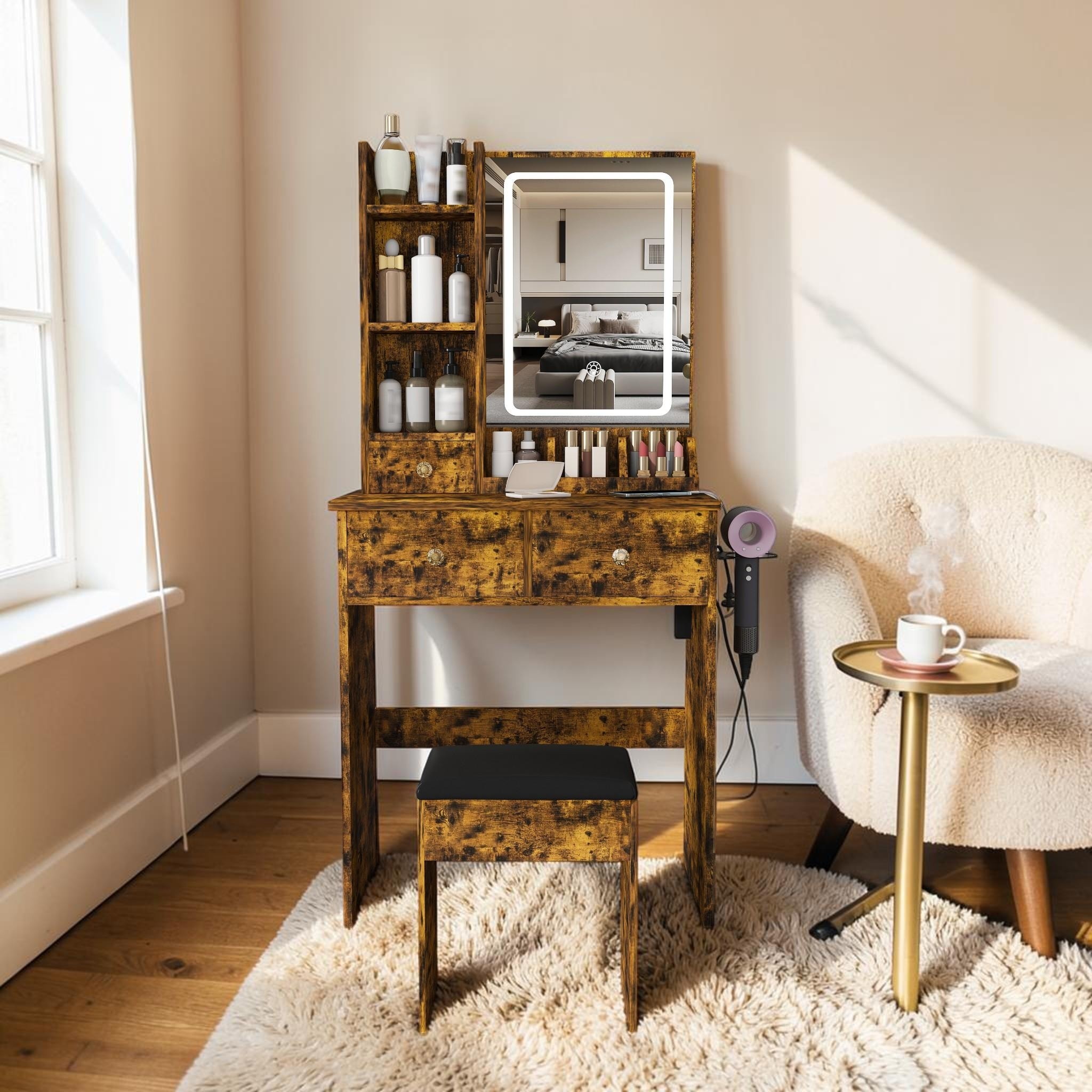 Product Introduction This multifunctional 3 in 1 vanity desk combines style, practicality, and space-saving design.