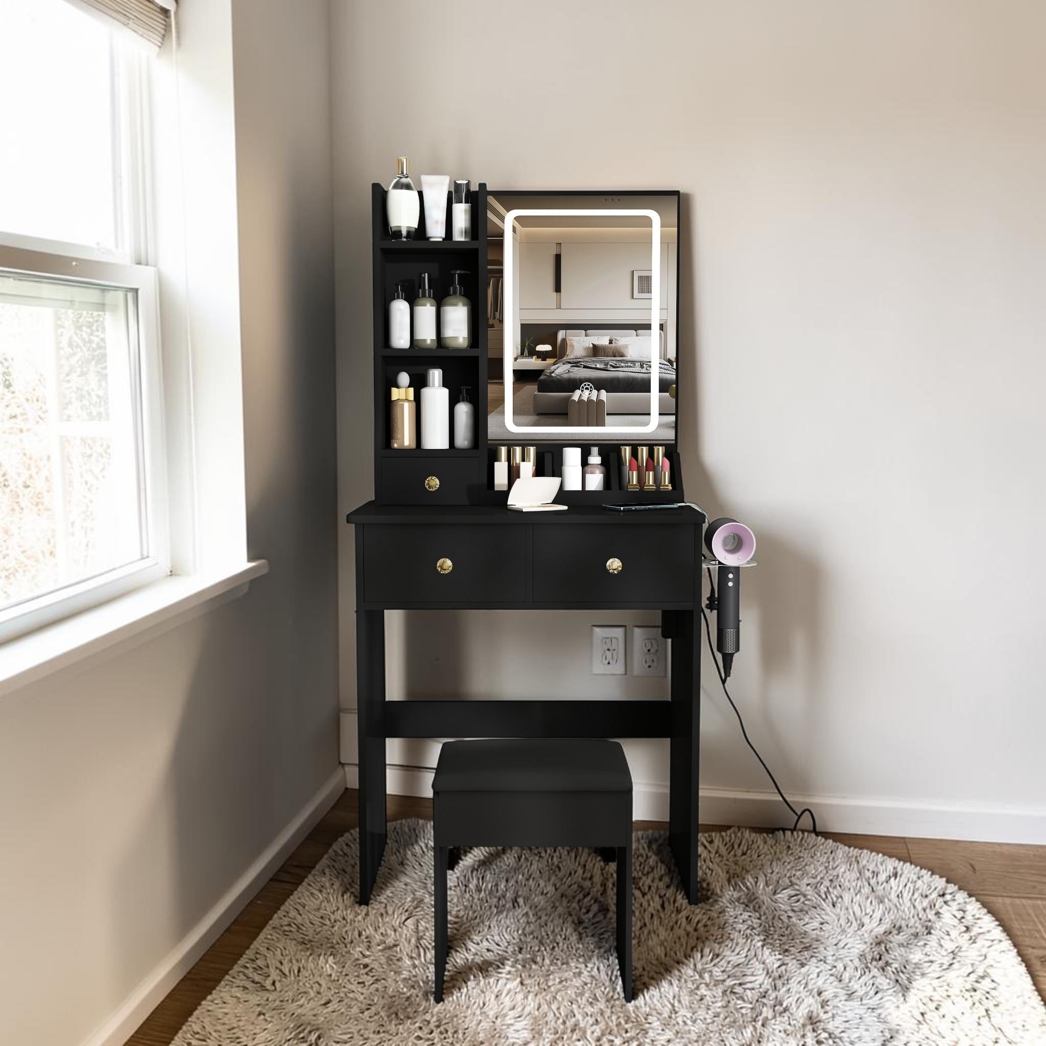 Small Makeup Vanity Desk with LED Lighted Mirror, 3 Drawers, Power Outlet, Hair Dryer Holder and Chair, Modern Vanity