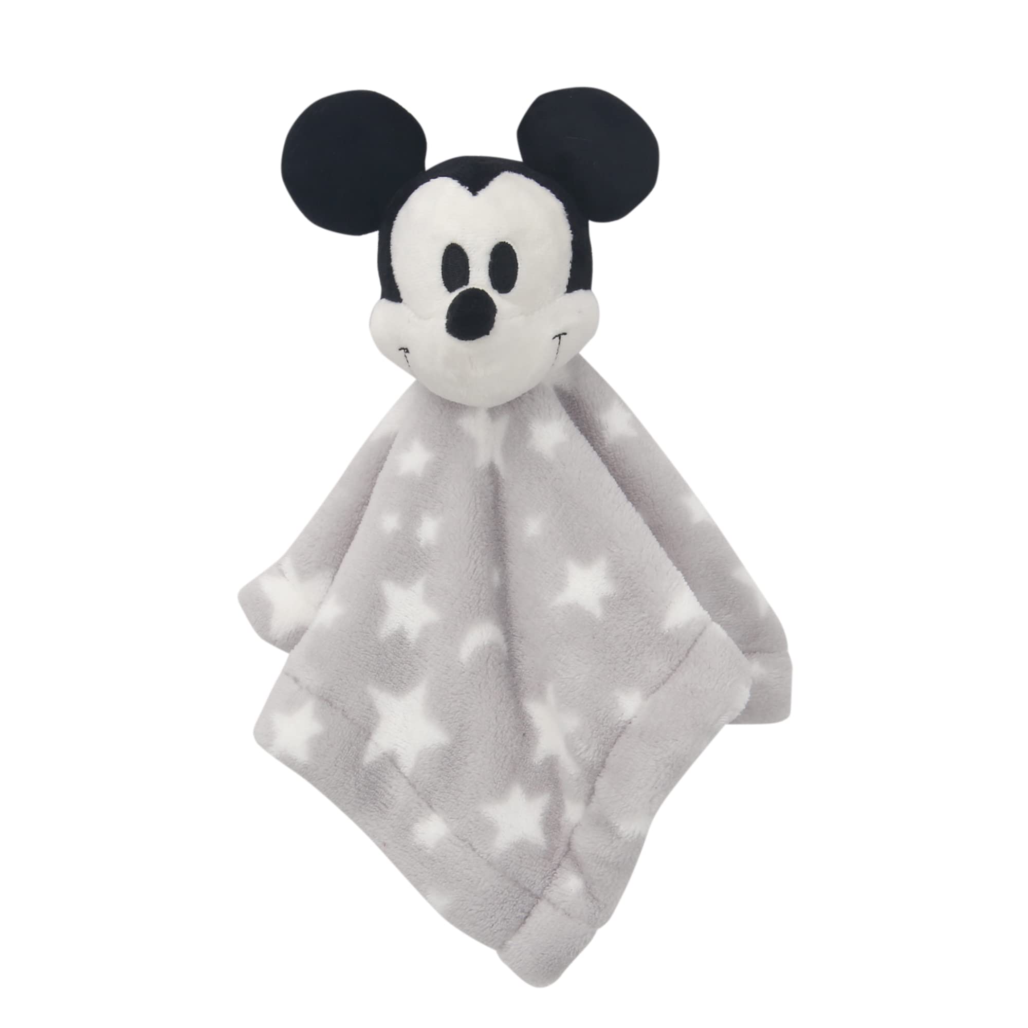 Officially licensed Disney Mickey Mouse security blanket / lovie Light gray ground with tossed white moons and stars 12” X 12” is perfectly sized for little hands Expertly embroidered velour face making this lovie baby safe Helps baby self soothe and makes a great welcome home baby gift Our gray