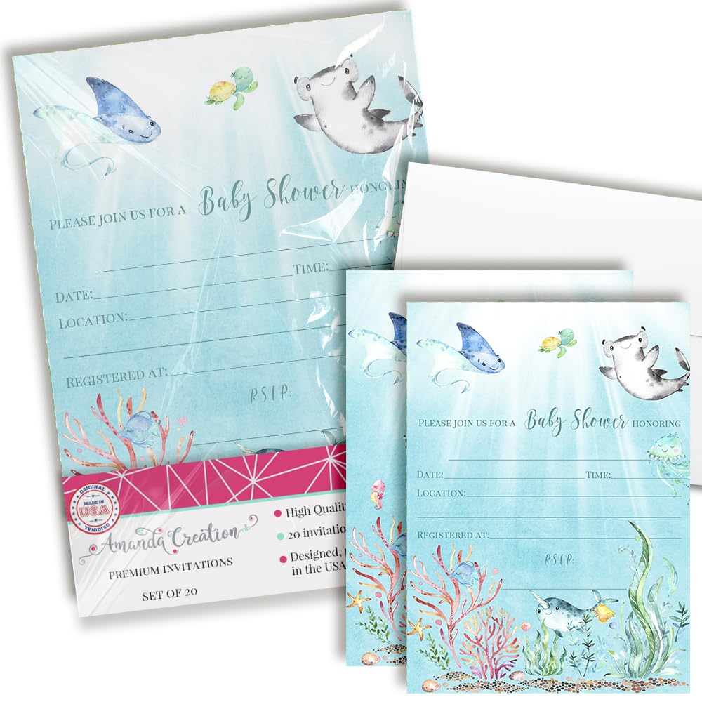 Underwater Cute Sea Life-Themed Baby Sprinkle Shower Invitations, 20 5x7 Fill In Cards with Twenty White Envelopes by AmandaCreation
