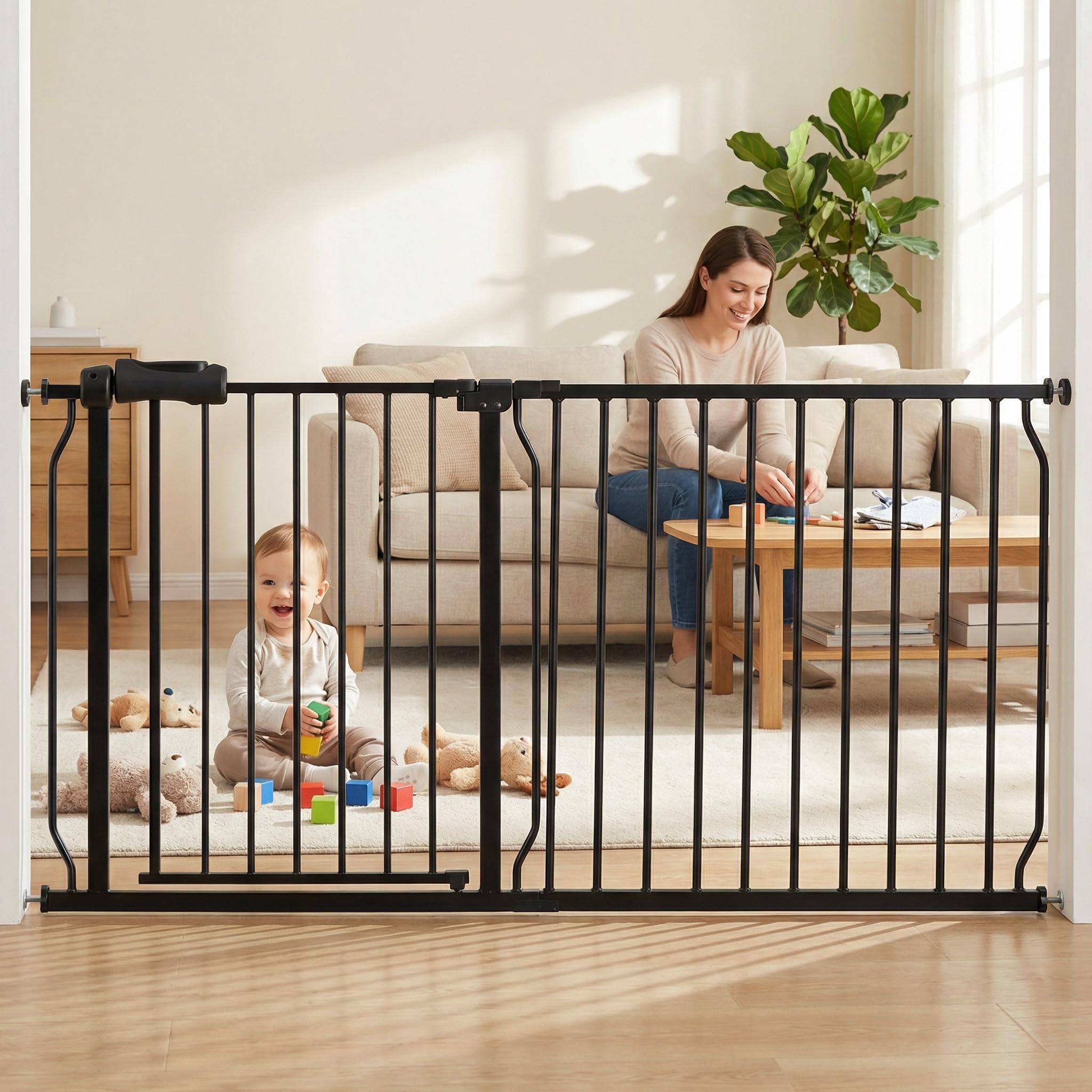 COSEND Extra Wide Baby Gate Extra Tall Tension Indoor Safety Gates Black Metal Large Pressure Mount Pet Gate Walk Through Safety Dog Gate for The