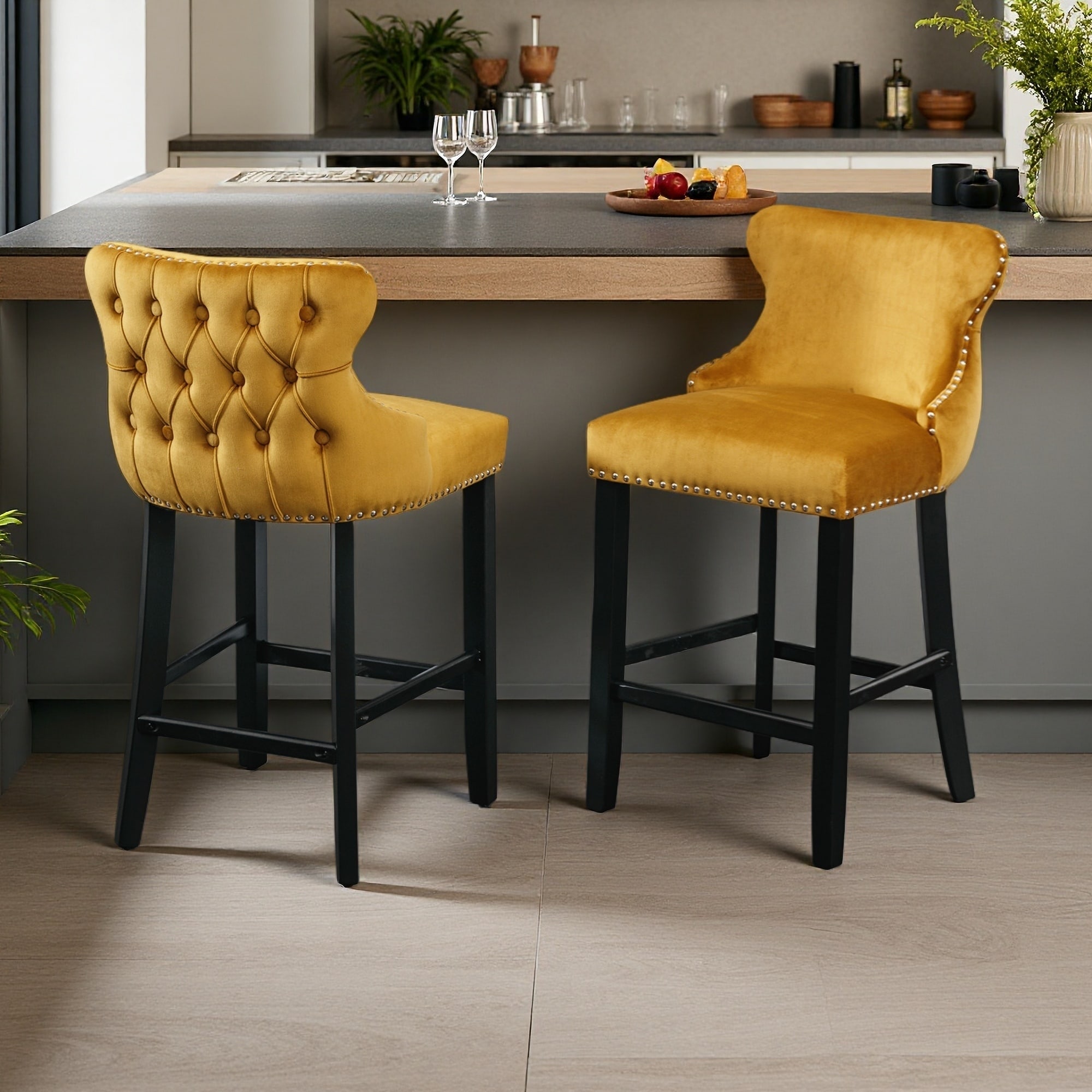 Velvet Wingback Bar Stools Set of 2 with Button Tufted Back, Wooden Legs and Chrome Nailhead Trim