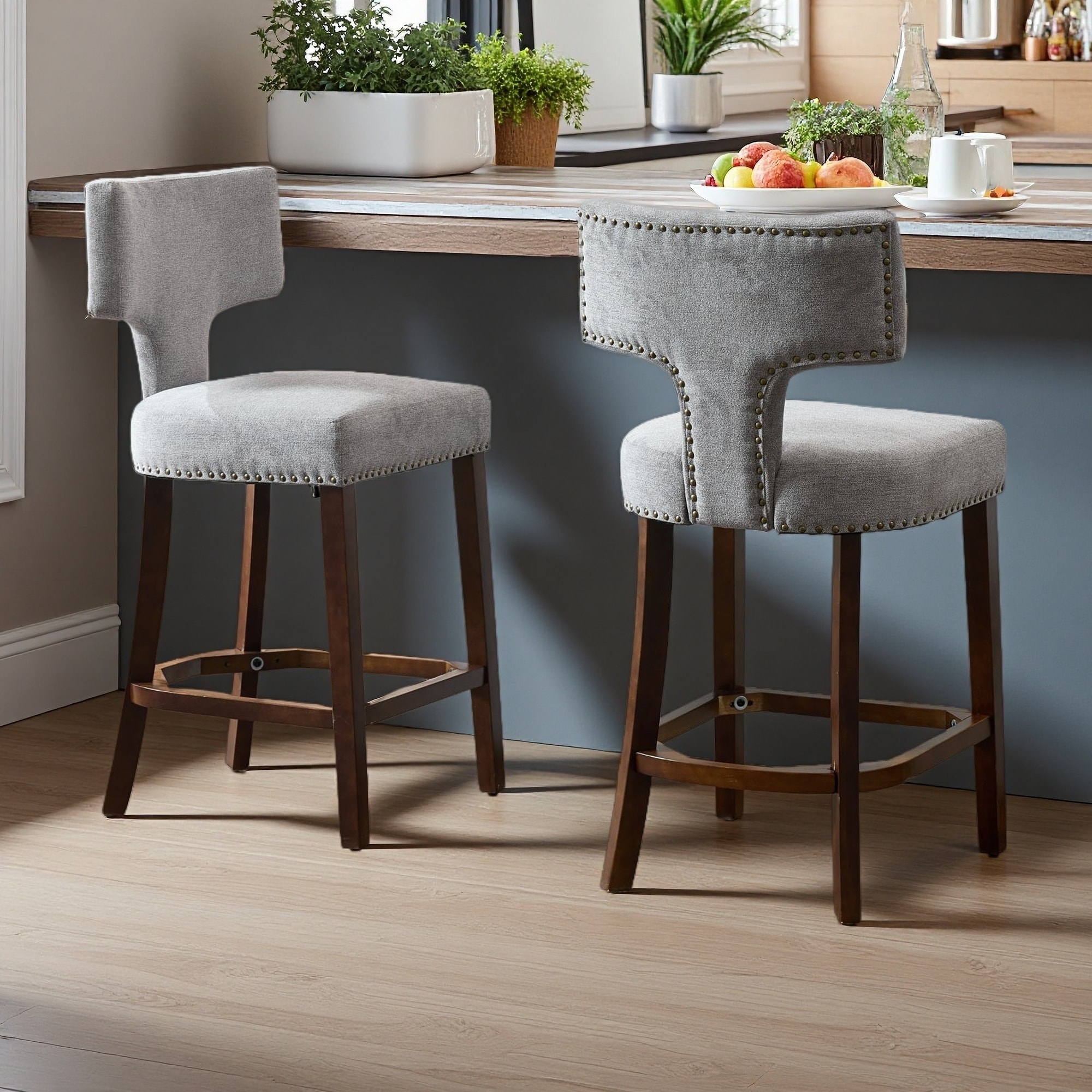 Mid-Century Modern Counter Height Bar Stools Set of 2 with Linen Upholstery, Curved Back and Copper Nail Trim