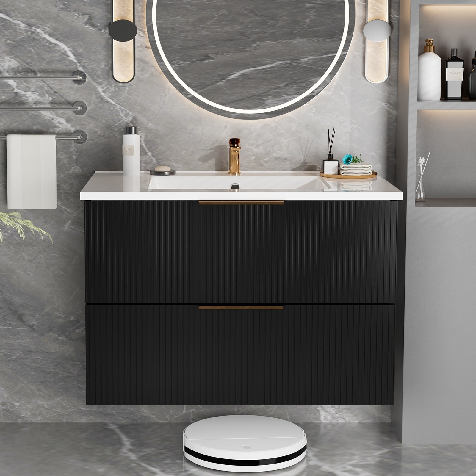 WALL MOUNTED DESIGN : Our modern bathroom vanity is floating to protect the bottom from moisture, which can also greatly reduce sanitary dead corners and reduce your daily cleaning work BIG STORAGE SPACE : Our bathroom vanities feature two large drawers,…