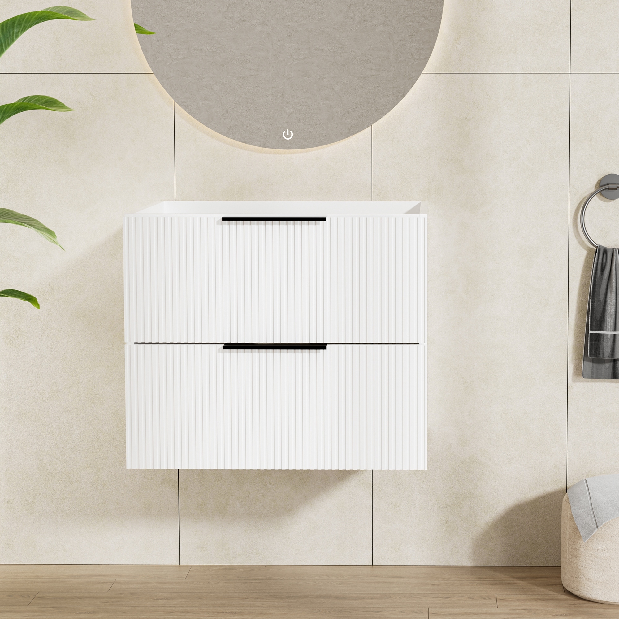 Add style and smart organization to your bathroom with this modern minimalist vanity, featuring a unique cabinet pattern that creates visual appeal under lighting.