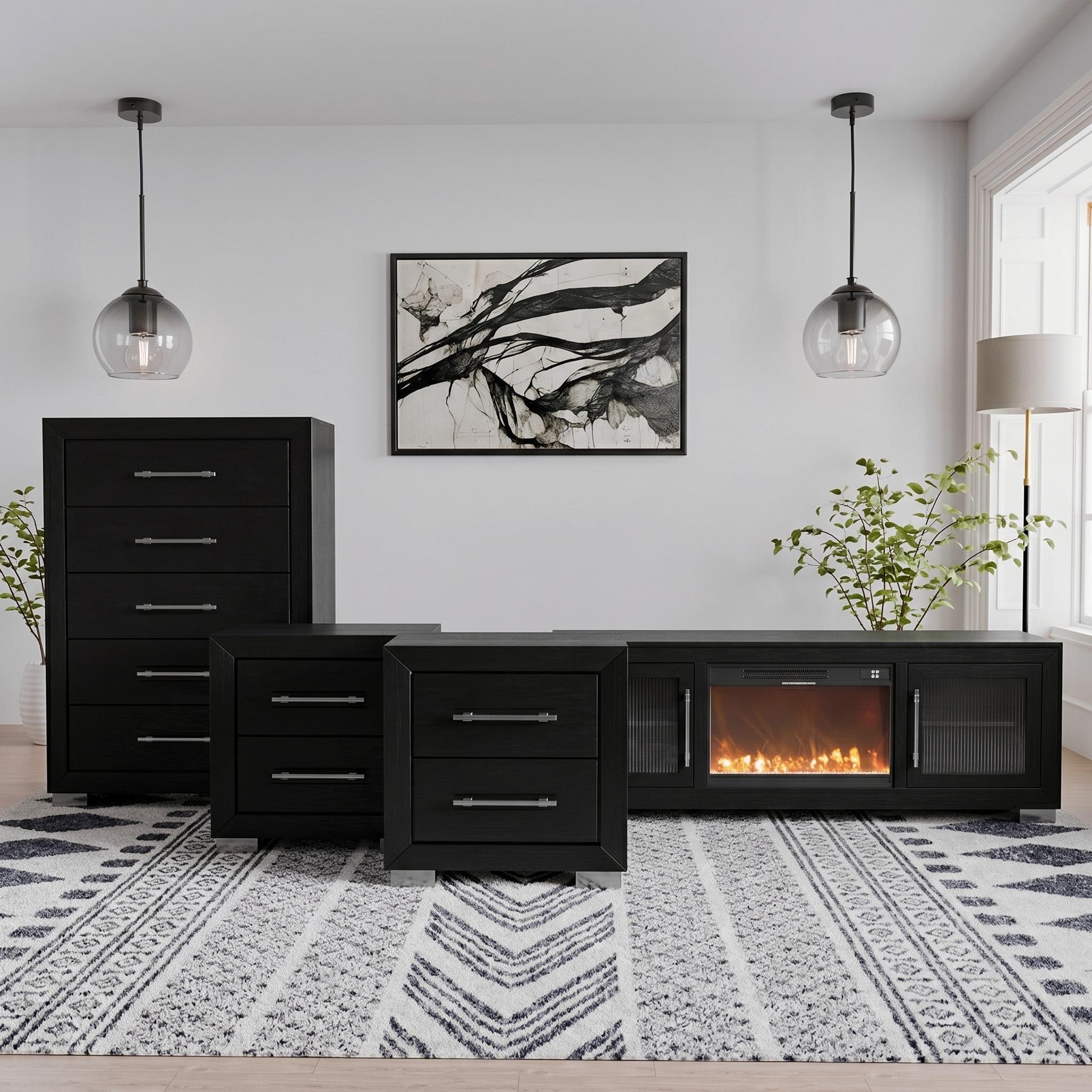 Furniture of America Alaric Modern Black Solid Wood 72-inch Fireplace TV Stand, Chest and 2 Nightstands Bedroom Set
