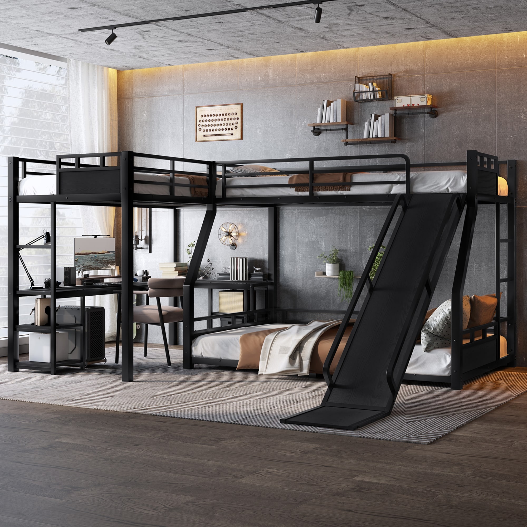 L-Shaped Metal Bunk Bed (Top bed: twin, bottom bed: full ) with Twin Loft Bed, Desk, Metal Triple Bunk Bed