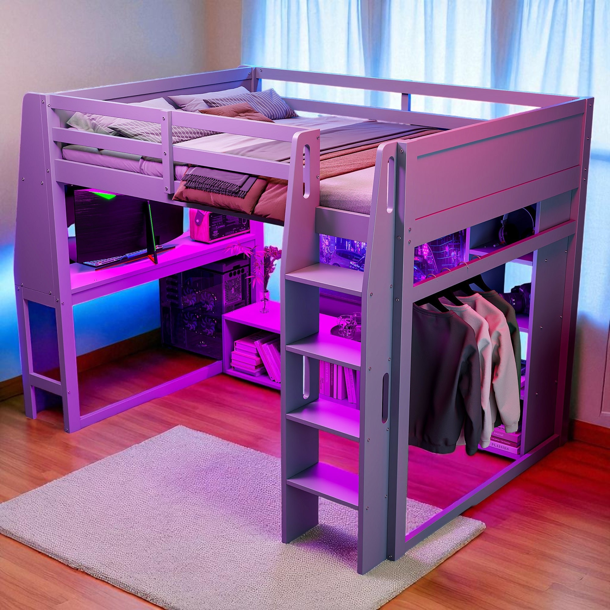 Twin/Full Size Gray Gaming Loft Bed with Desk, Storage Cabinets, LED Lighting & Hanging Clothes Rack