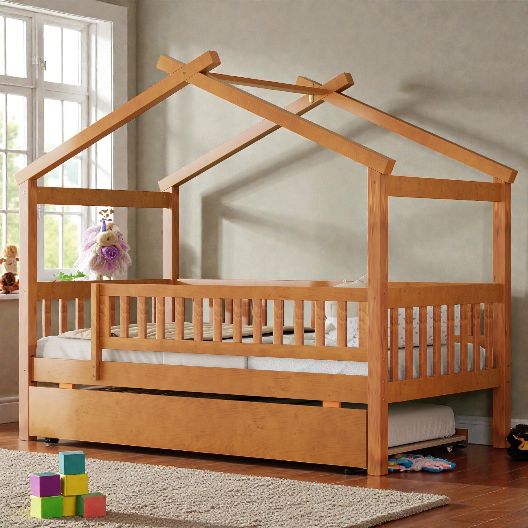 Product Introduction This wooden house bed brings creativity and comfort together in one charming design.