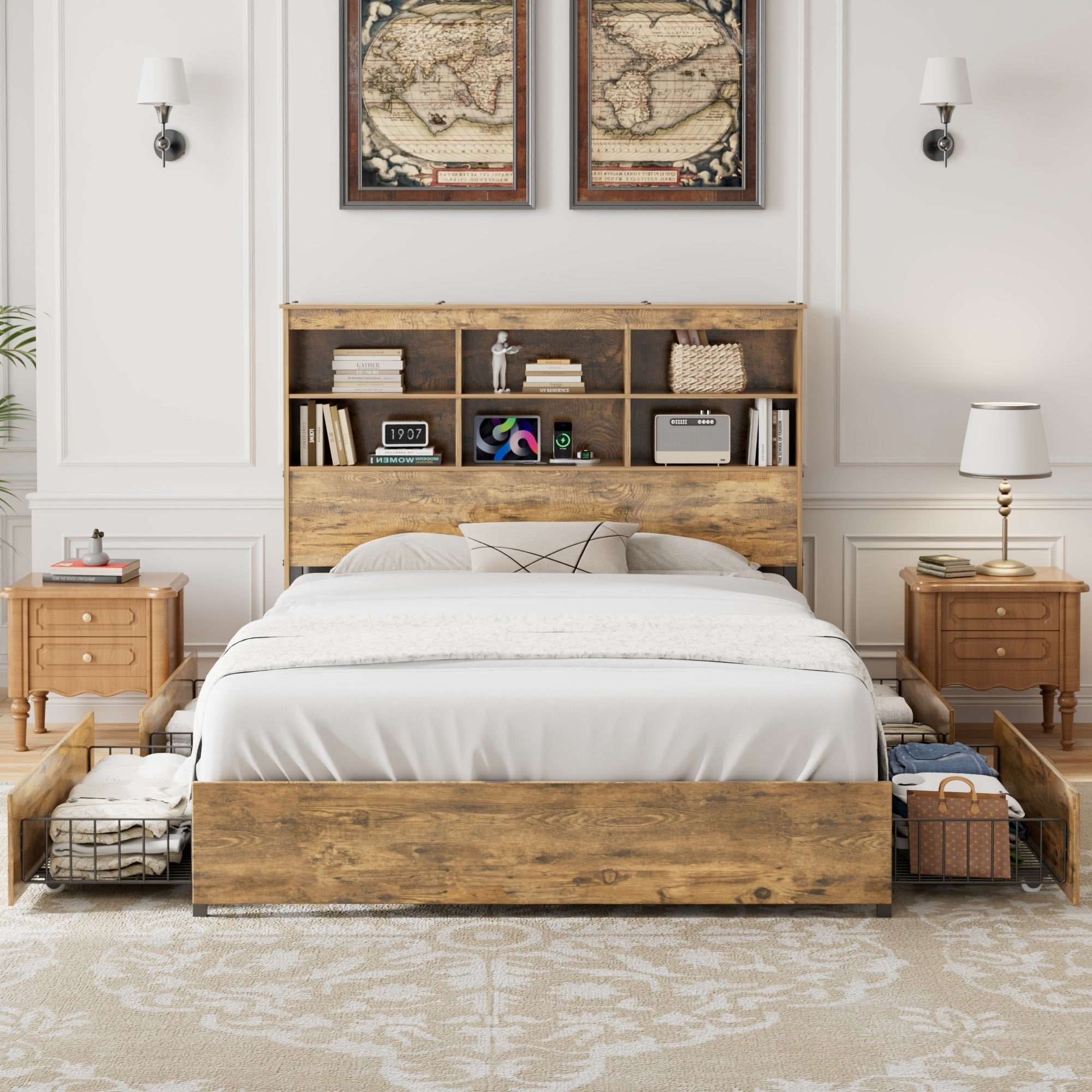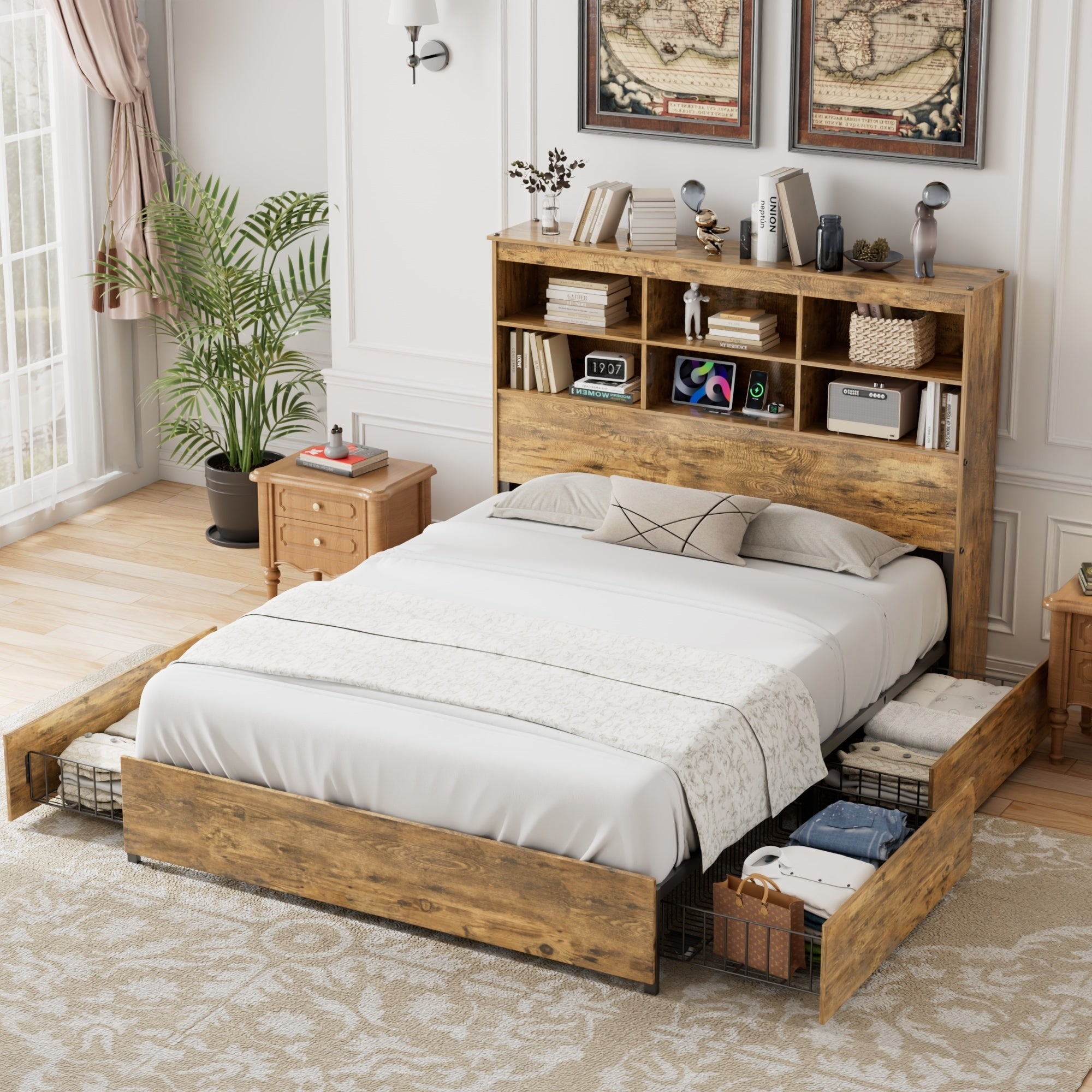 VECELO Storage Bed Frames Farmhouse with 50" Tall Storage Bookcase Headboard, Charging Station,4 Drawers and Metal Frame Support