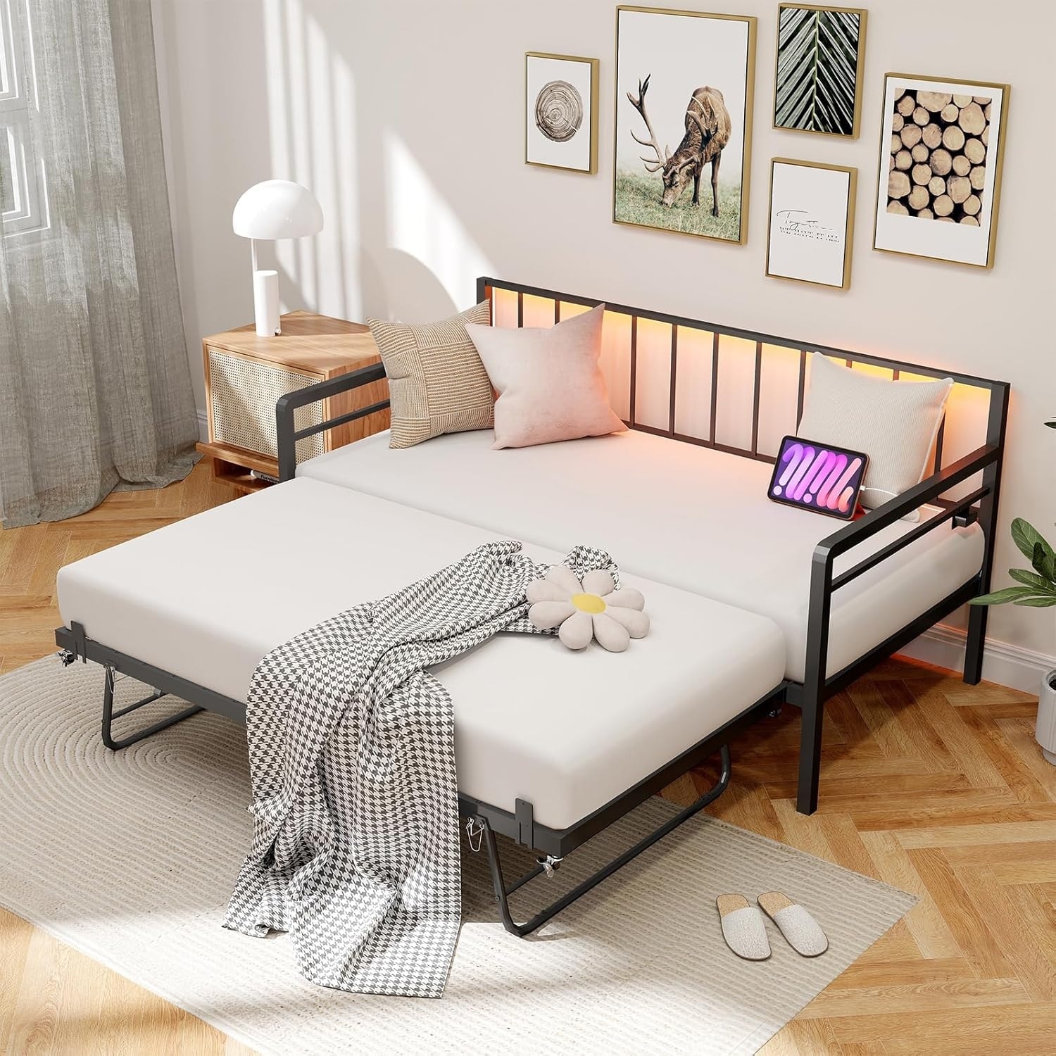 Twin Daybed with Pop-Up Trundle, LED Lights, Charging Station, Heavy-Duty Metal Frame, Black