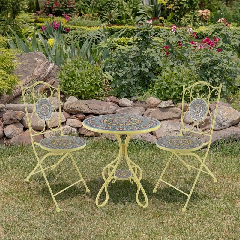 Brighten your patio or indoor space with this three-piece round mosaic bistro set in yellow and blue.
