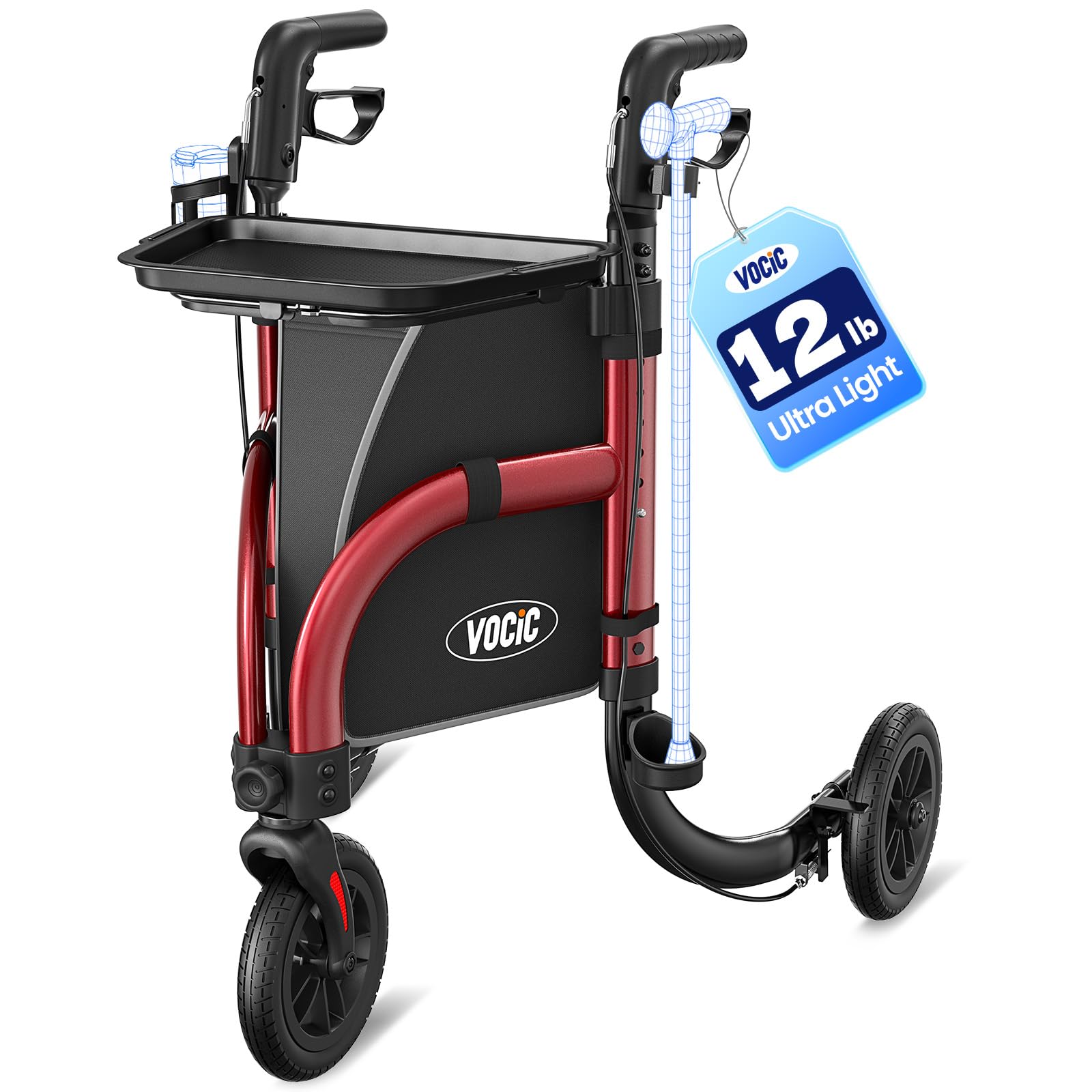 VOCIC 3 Wheel Walkers for Seniors,Z25 Pro Foldable Rollator with 8" Airless Tires & Non-Slip Tray, Cane Holder & Cup Holder, Lightweight Three Wheel