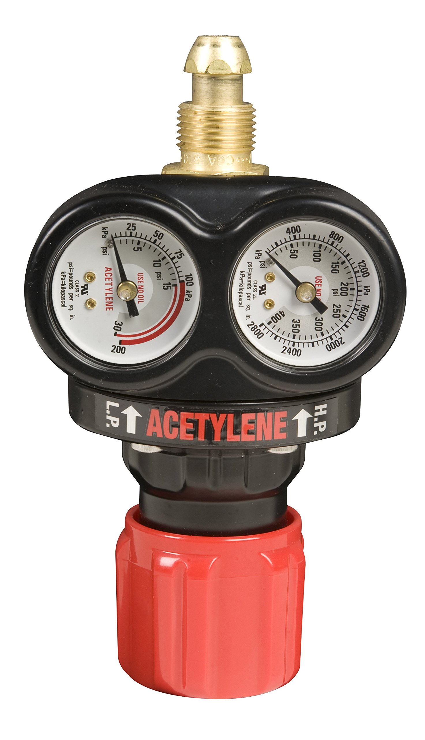 Gas Service: Acetylene Delivery Range (psig): 2-15 CGA 510 Connection: Acetylene (POL) Gauge Range Inlet: 400 Gauge Range Outlet: 30 Medium-capacity, single-stage design Forged brass body Zinc-Aluminum housing cap High impact ABS gauge guard Stem-type seat mechanism