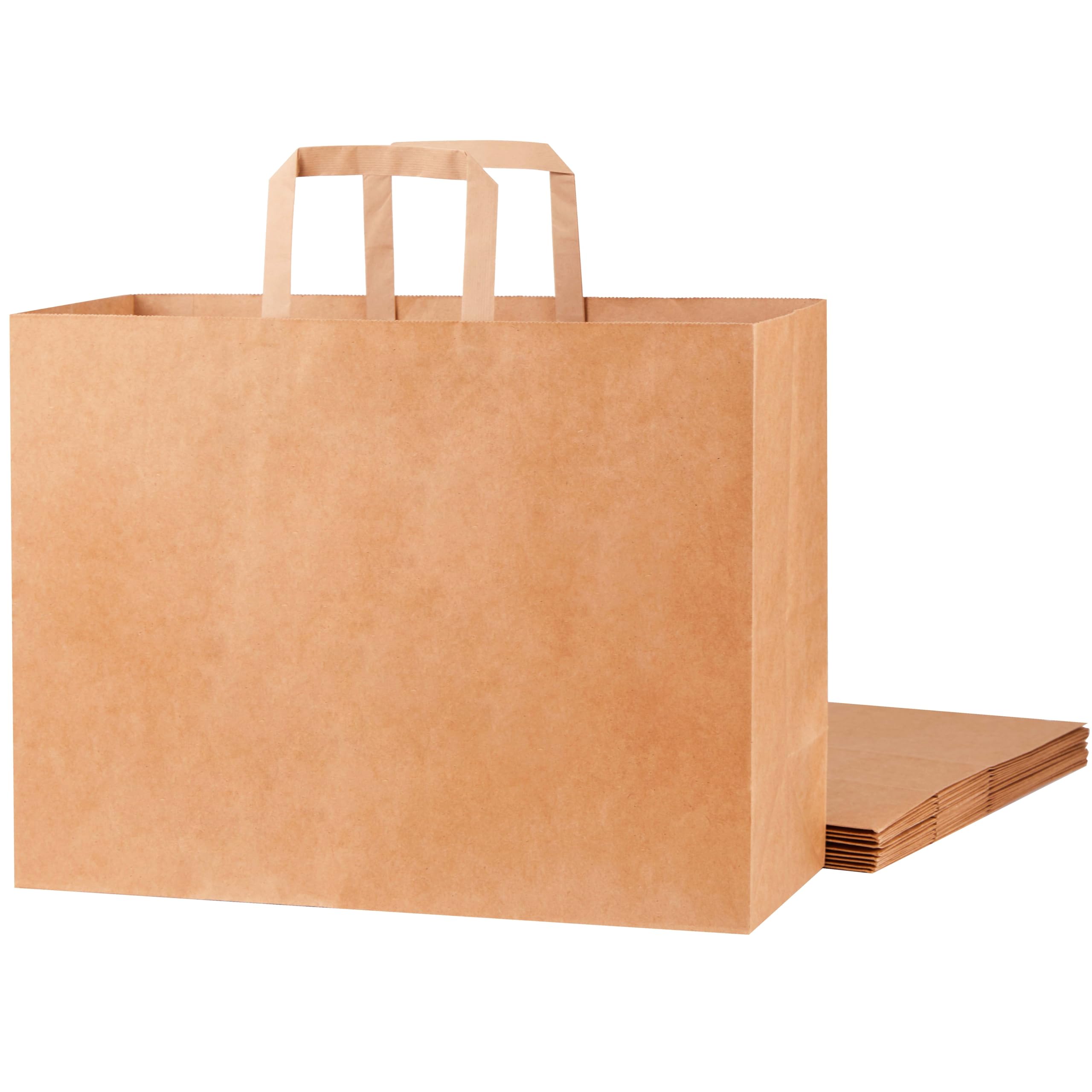 Package includes: 50 kraft brown paper bags with handles in natural brown color. Each bag measures 16 inches in width, 12 inches in height and 6 inches in depth. Premium material: Our shopping bags are made of thick and durable kraft paper, with strong rope handles for easy carrying. The material is