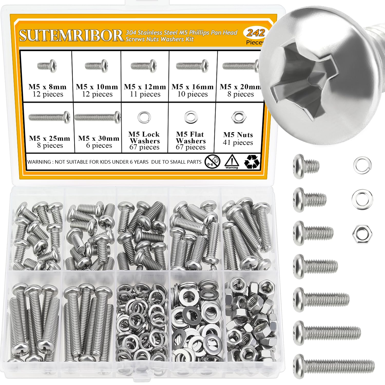 242 Pieces M5 Machine Screws Nuts Washers Set, Sutemribor M5 x 8/10/12/16/20/25/30mm Phillips Pan Head Machine Screws Nuts Washers Assortment Kit, 304