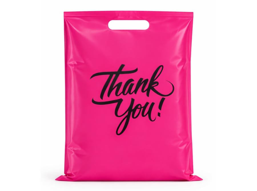 PLASTIC SHOPPING BAGS: Our Thank you bags with a Black printed logo are must-haves for small businesses or boutiques that sell clothing, craft supplies, jewelry or any other merchandise. Bring your small business or boutique up a notch with our beautiful and classy large thank you bags. SIZE & DIMEN
