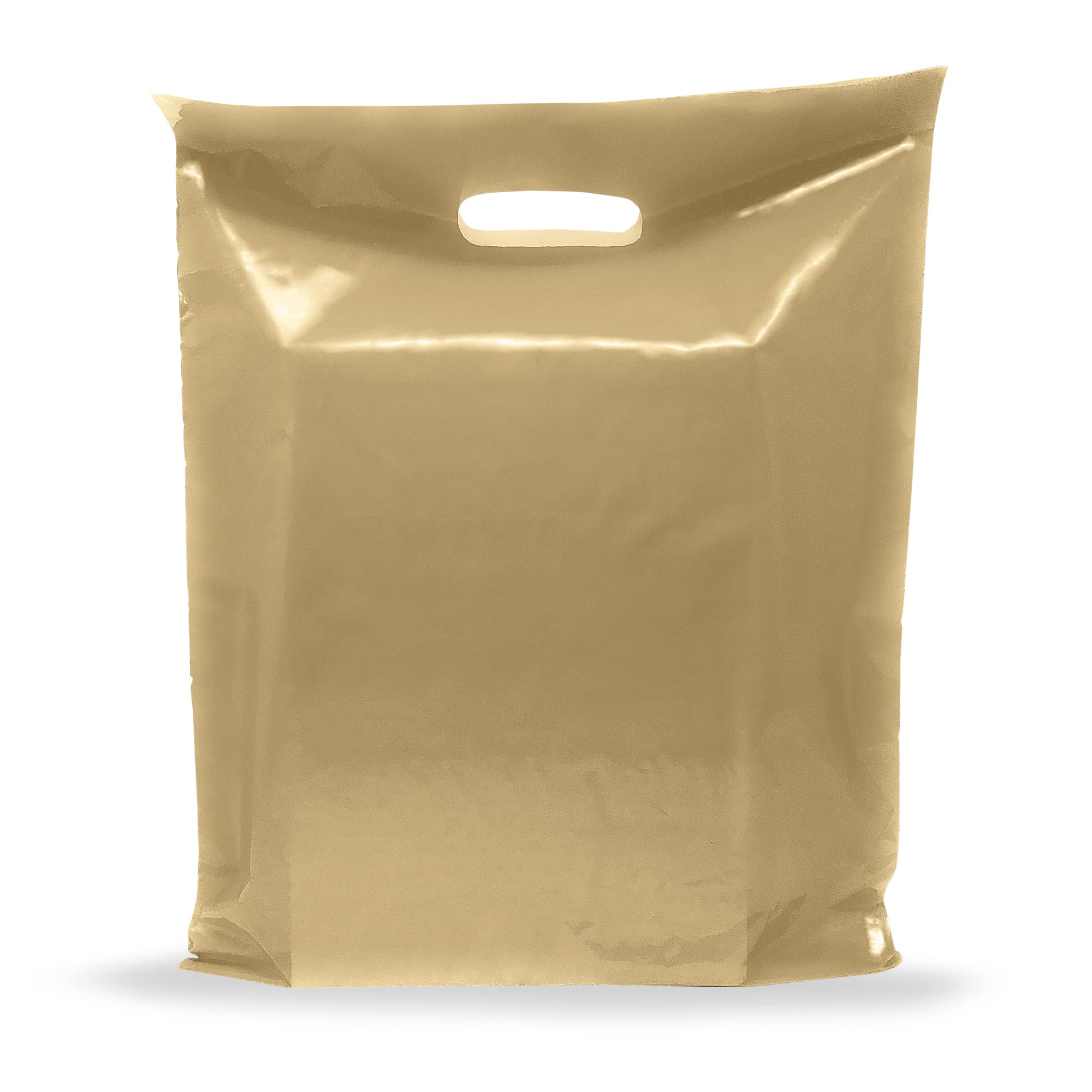 Pack of 100 Gold Glossy Bags Die Cut Handles, Measures: 9" x 12" by 2 Thickness Colorful, Very Strong, Reusable, Durable and Convenient. Beautiful Colors, Multi purpose, User Friendly, Ideal for Shopping, Retail, Party, Vendor Event Supplies. Good for Business, Clothing Stores, Gifts,Thank You Prese