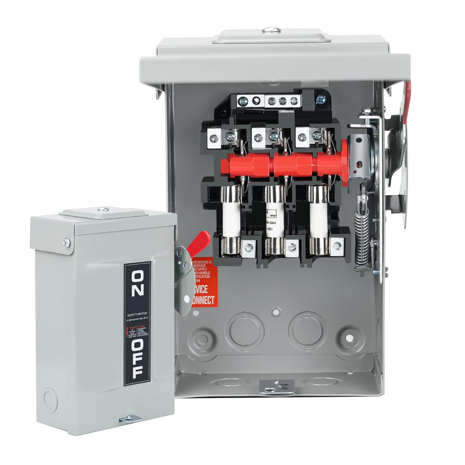3P FUSE SAFETY SWITCH: This is a 30A, 240V, 3-phase safety switch with a 30A overload fuse; it can quickly fuse and disconnect the switch to protect the power supply and equipment safety and prevent accidents QUICK CONNECT&DISCONNECT SWITCH:external hinge switch handle that can quickly connect and d